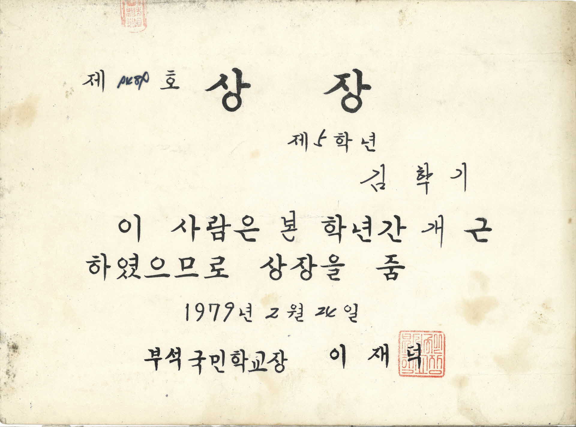 이 상장(賞狀)은 1979년 2월 24일 부석초등학교 교장 이재덕이 본 학년간 개근한 제5학년 김학기 학생에게 발급된 것이다. 발급번호는 9489호이다. 부석고등학교는 1975년 4월 26일 개교식, 1975년 12월 27일 부석고등학교 인가(남녀공학 6학급), 1977년 9월 교사 증축, 2008년 2월 29일 폐교되었다.