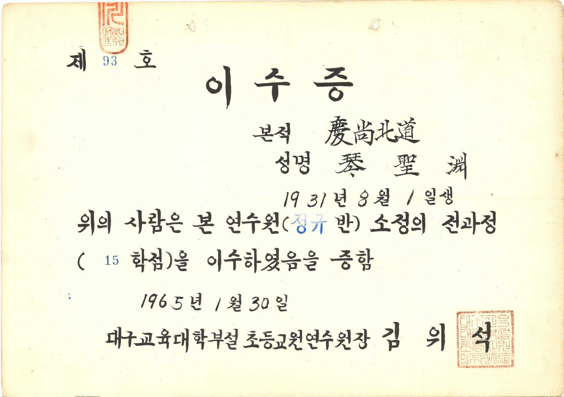 이 이수증은 1965년 1월 30일 대구교육대학 부설 초등교원연수원장 김위석이 본 연수원 정규반의 전과정(15학점)을 이수한 금성연에게 발급한 것이다.