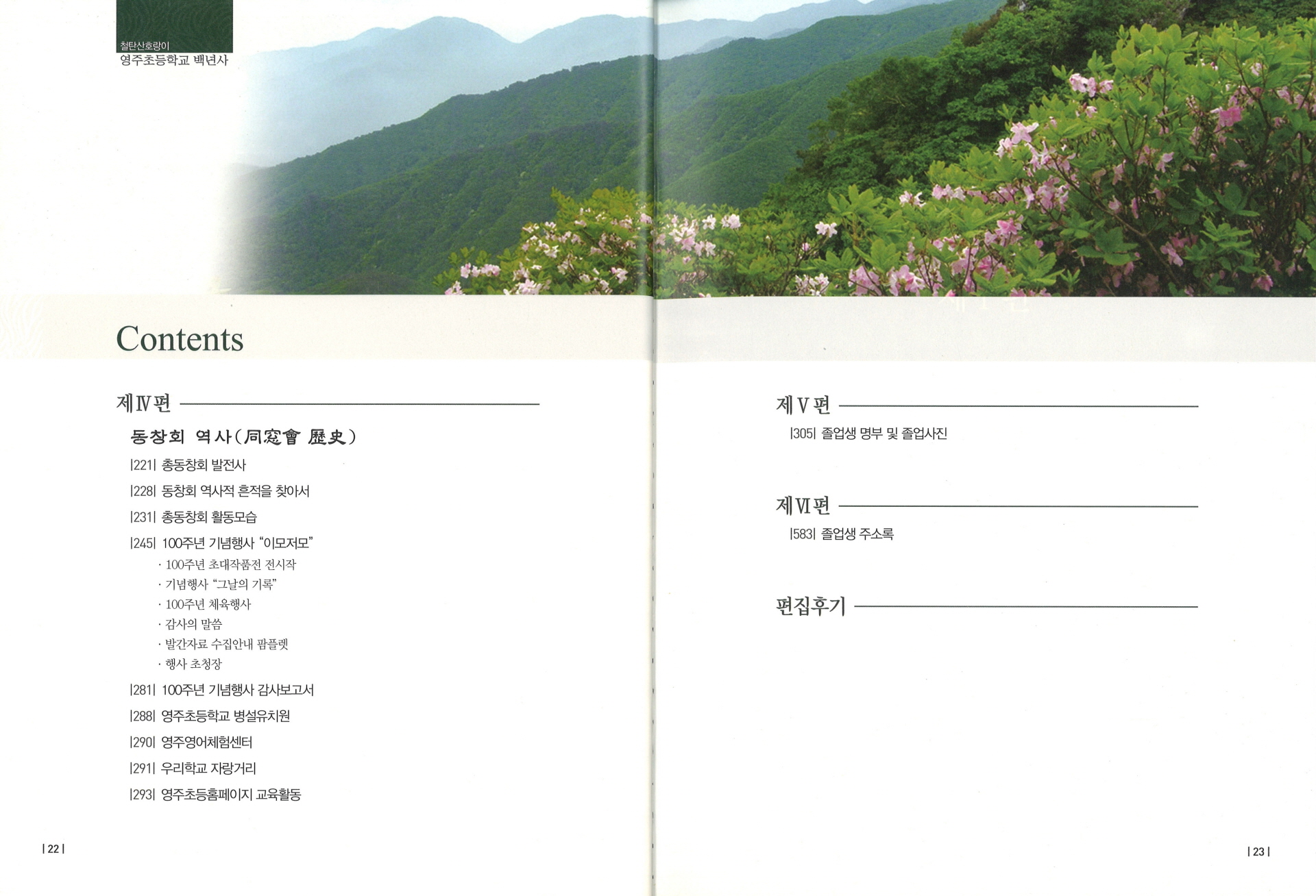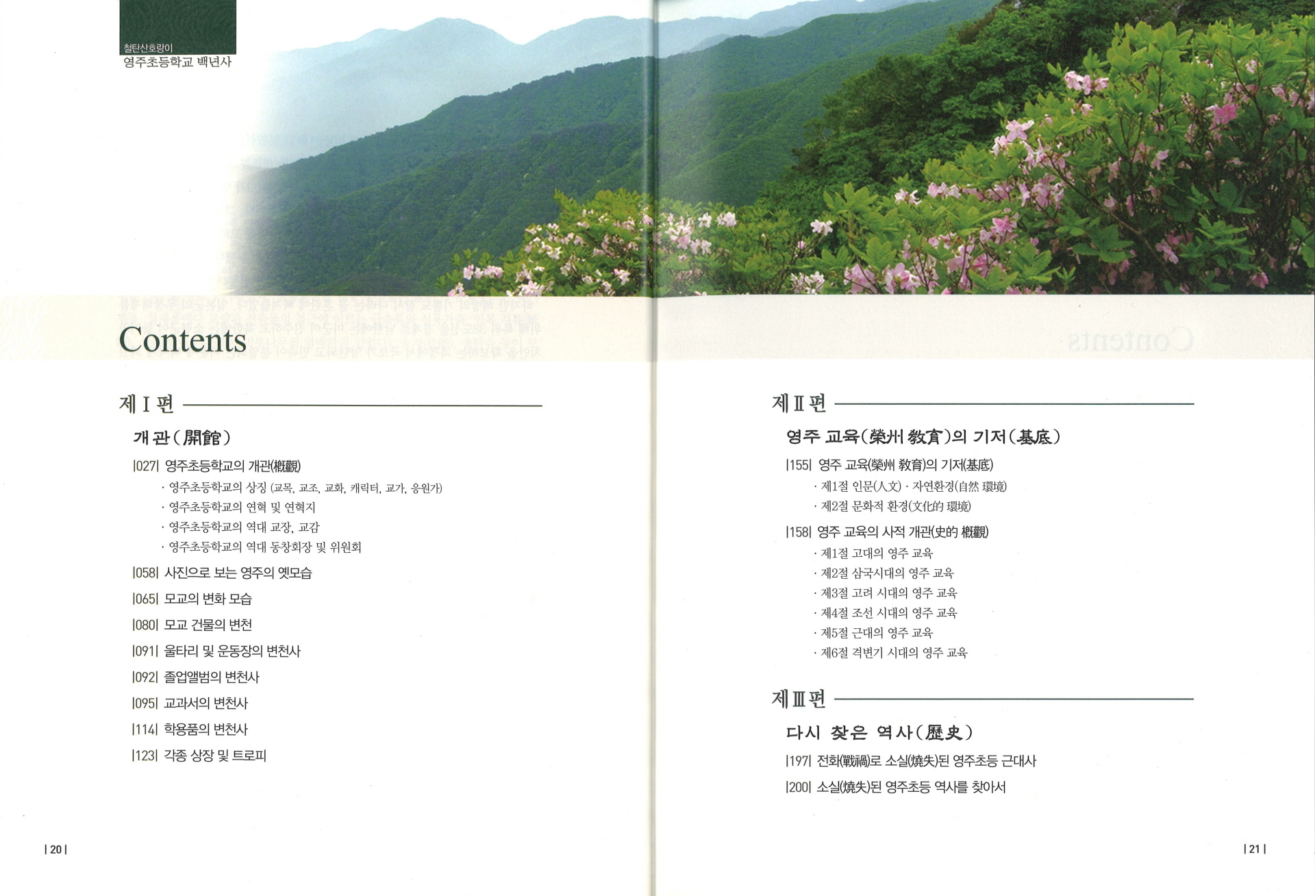 2012년 9월 20일 영주초등학교 백년사편찬위원회가 편집하고, 영주초등학교총동창회에서 발행한 영주초등학교 백년사이다. 분량은 698면이며, 남북기획에서 인쇄하였다. 영주초등학교는 1909년 사립 강명학교로부터 시작되어 현재에 이르고 있다.
