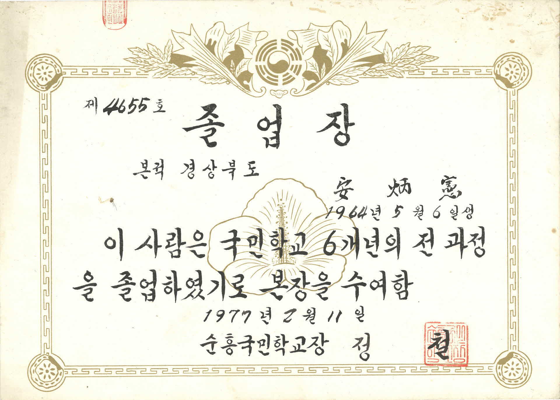 이 졸업장(卒業狀)은 증서 번호 제4655호로 순흥국민학교(順興國民學校) 교장 정철이 1977년 2월 11일 졸업생인 안병헌(安炳憲) 학생에게 발급한 것이다. 수업연한(修業年限)은 6년이고, 졸업장에는 본적과 생년월일이 기록되어 있다.