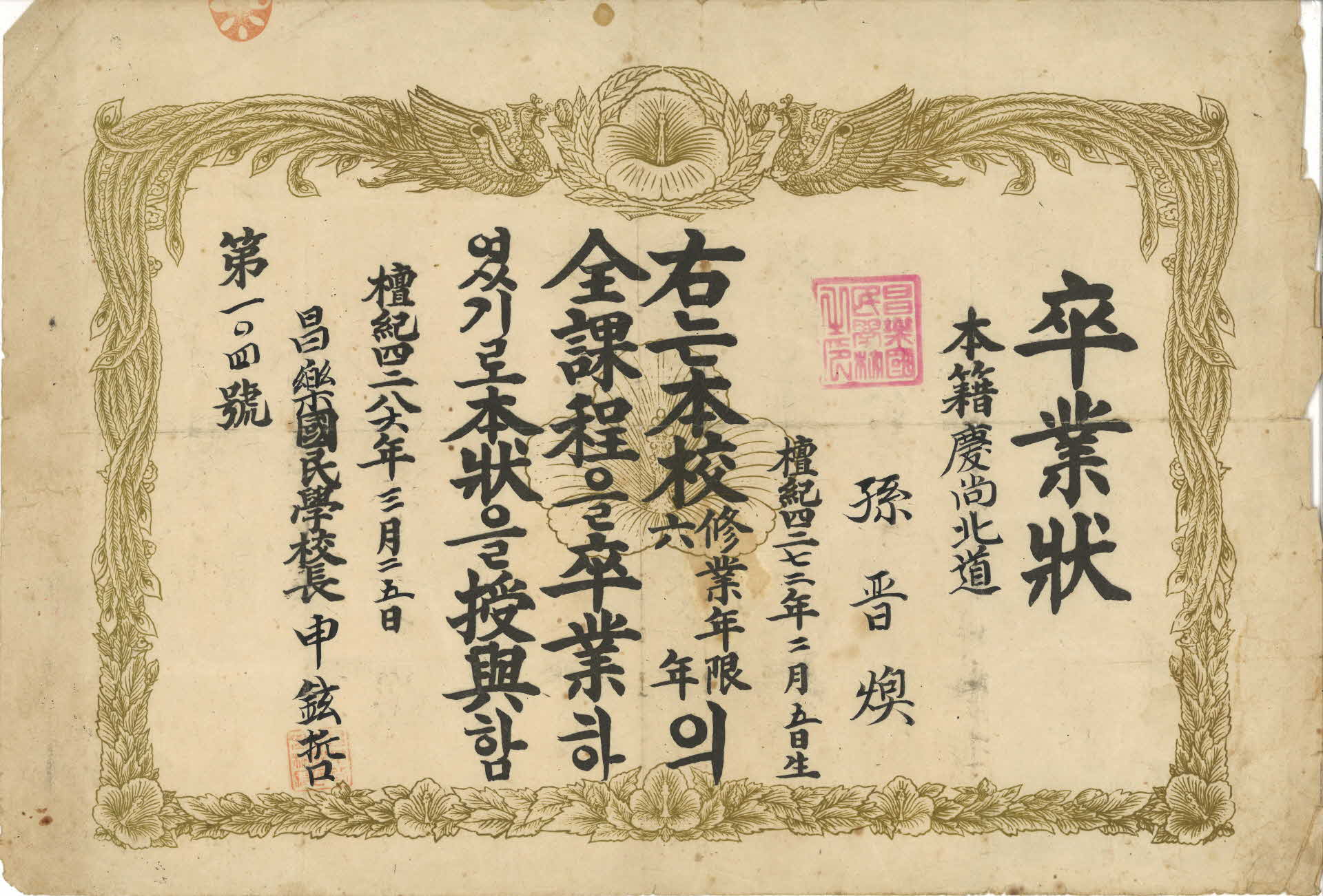 이 졸업장(卒業狀)은 증서 번호 제104호로 창락국민학교(昌樂國民學校) 교장 신현철(申鉉哲)이 1953년 3월 25일 졸업생인 손진환(孫晉煥) 학생에게 발급한 것이다. 수업연한은 6년이고, 졸업장에는 본적과 생년월일이 기록되어 있다.