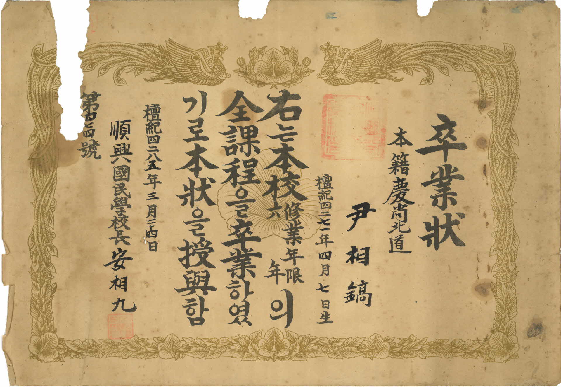 이 졸업장(卒業狀)은 증서 번호 제474호로 1952년 3월 24일 순흥국민학교장(順興國民學校長) 안상구(安相九)가 졸업생인 윤상호(尹相鎬) 학생에게 발급한 것이다. 수업연한(修業年限)은 6년이고, 졸업장에는 본적과 생년월일이 기록되어 있다.