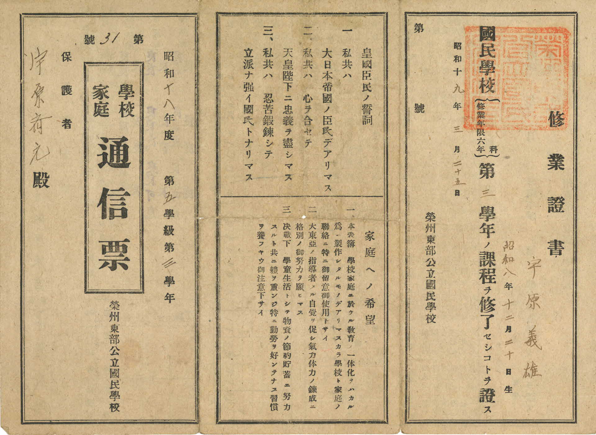 이 통신표(通信票)는 제31호로 영주동부공립국민학교장(榮州東部公立國民學校長) 가옥동길(假屋東吉)이 1943년(소화 18) 제5학급 제3학년 송원의웅(宋原義雄)학생에게 발급한 것이다. 보호자(保護者)는 송원제윤(宋原齊允)이다.