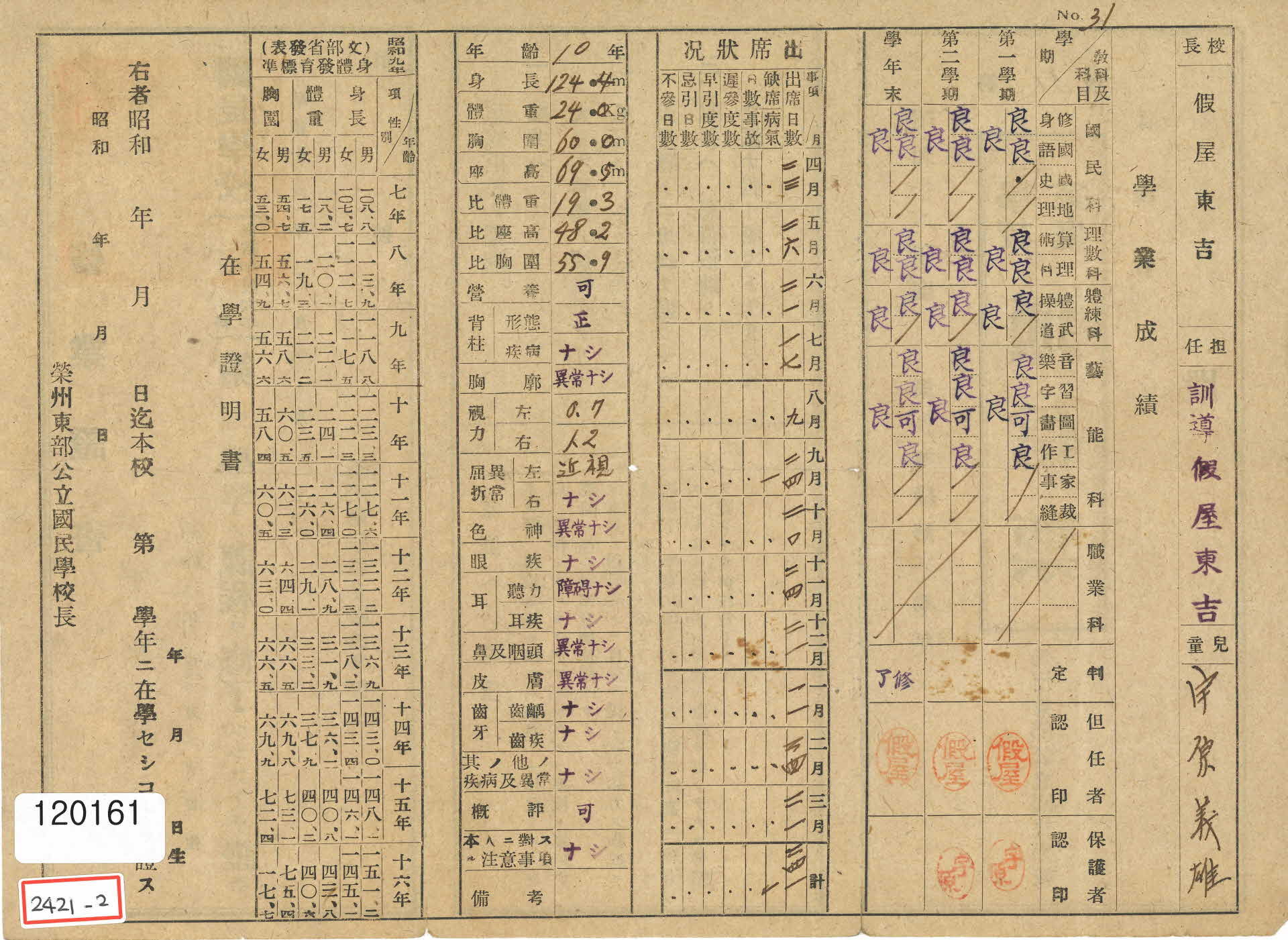 이 통신표에는 학업성적(學業成績)과 출석상황(出席狀況), 신체검사표, 문부성발표 신체발육표준서 등이 기록되어 있다. 특히 당시 교과목인 국민과(수신, 국어, 국사, 지리), 이수과(산술, 이과), 체련과(체조, 무도), 예능(음악, 습자, 도화, 공작, 가사, 재봉), 직업과 등의 과목이 기록되어 있다.