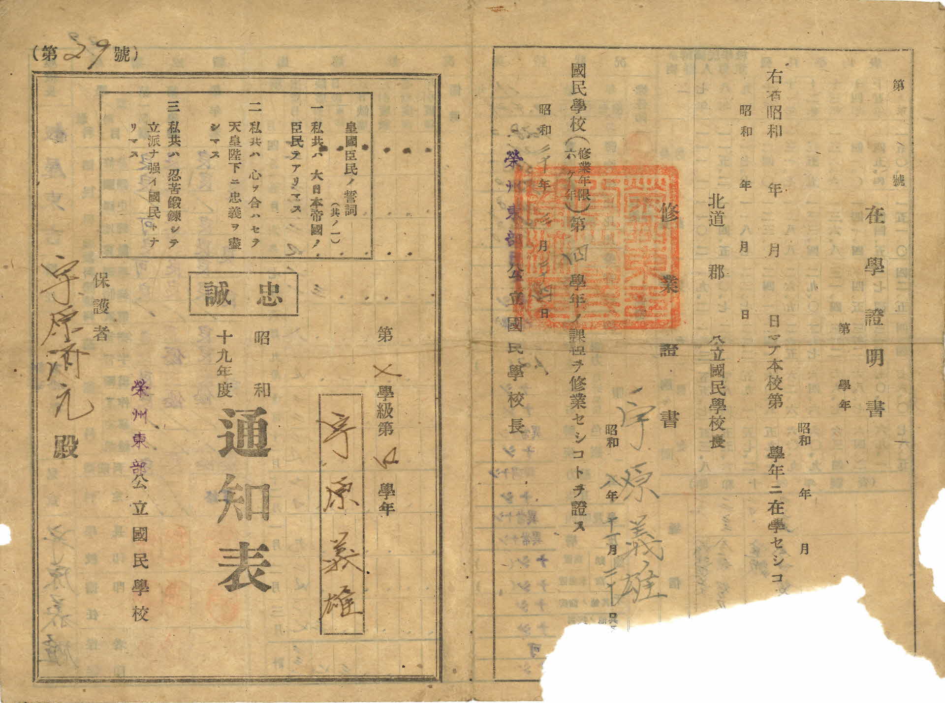 이 통신표(通信表)는 1944년(소화 19) 영주동부공립국민학교장(榮州東部公立國民學校長) 가옥동길(假屋東吉)이 제7학급 제4학년 송원의웅(宋原義雄)학생에게 발급한 것이다. 보호자(保護者)는 송원제윤(宋原齊允)이다. 이 통신표에는 학업성적(學業成績)과 출석상황(出席狀況), 신체현황, 전조선초등학교 및 조선인아동발육평표 등이 기록되어 있다. 또한 1945년(소화 20)발급한 수업증서와 황국신민서사(皇國臣民誓詞), 재학증명서가 함께 기록되어 있어 일제강점기 교육의 단면을 보여주는 중요한 자료로 평가된다.