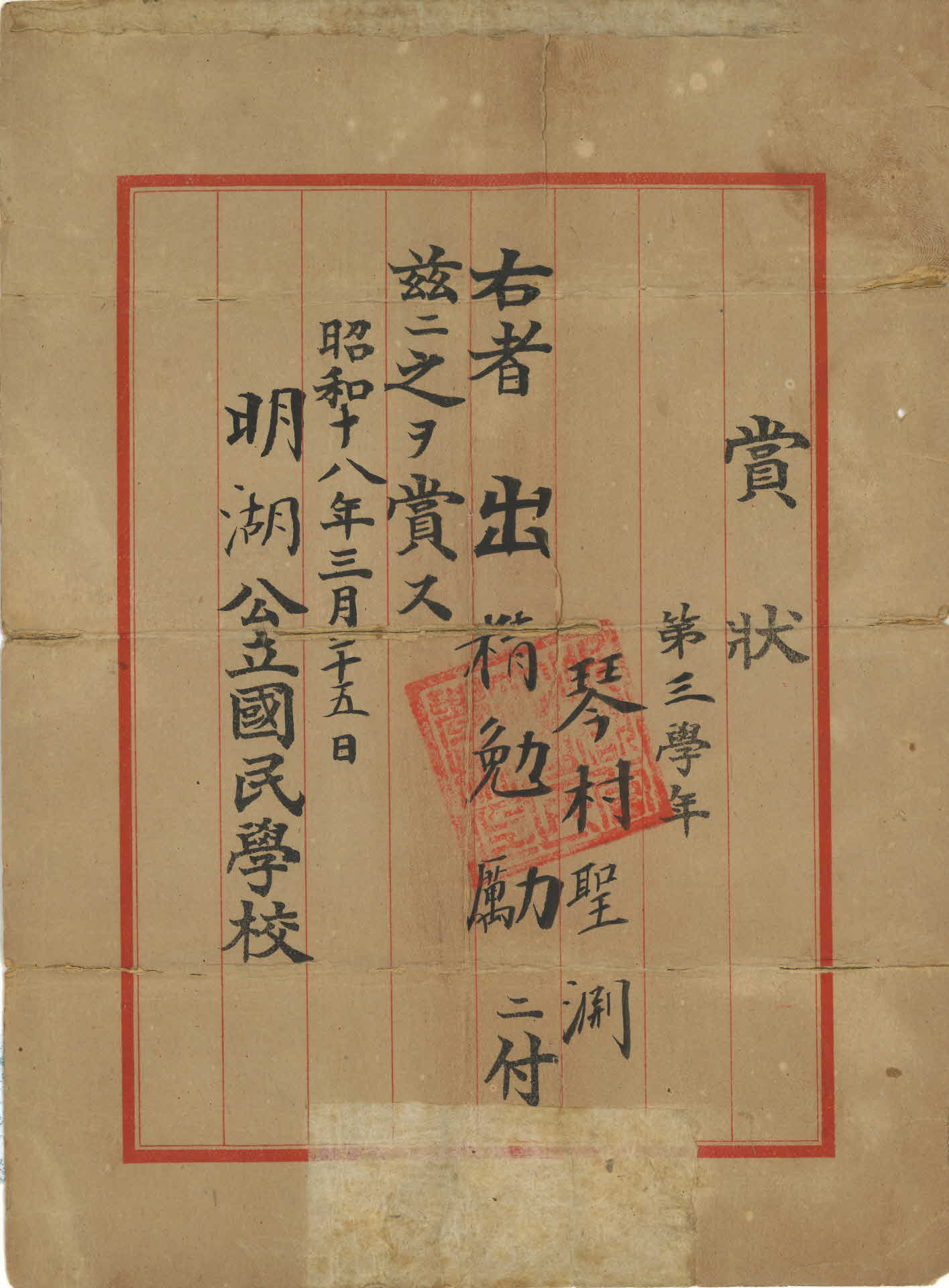 이 상장(賞狀)은 봉화의 명호공립국민학교(明湖公立國民學校)에서 1943년(소화 18) 3월 15일 제3학년 금촌성연(琴村聖淵) 학생에게 발급한 것이다.