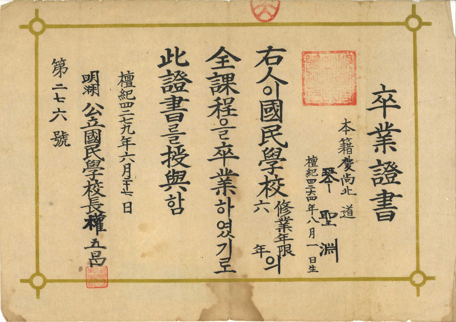 이 졸업증서(卒業證書)는 제276호로 봉화의 명호공립국민학교장(明湖公立國民學校長)이 1946년 6월 27일 금성연(琴聖淵) 학생에게 발급한 것이다. 수업연한(修業年限)은 6년이고, 졸업 증서에는 본적(本籍)과 생년월일이 기록되어 있다.