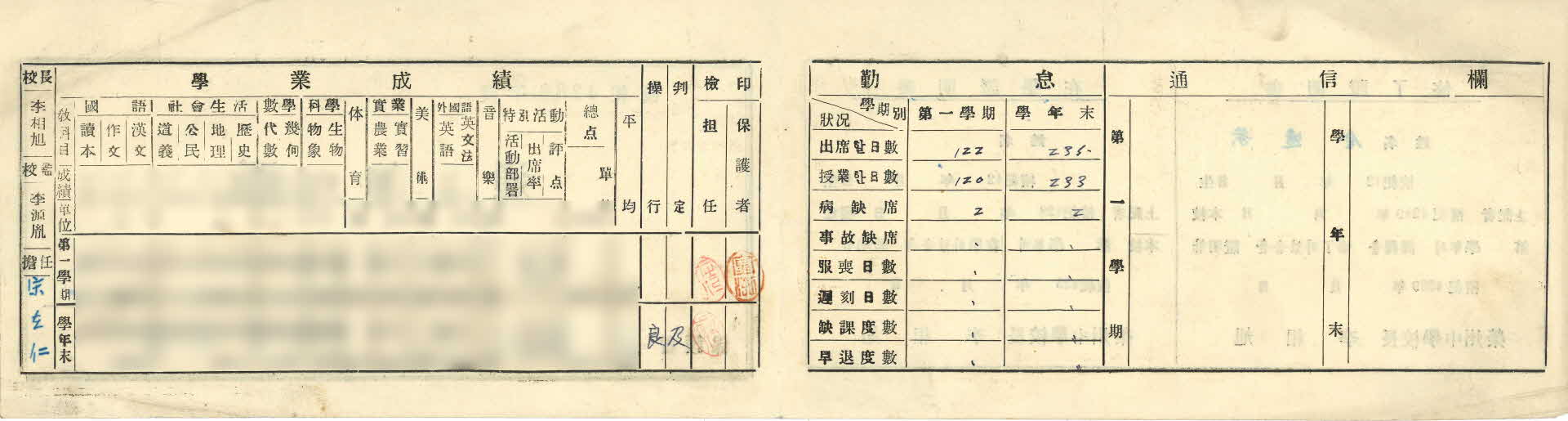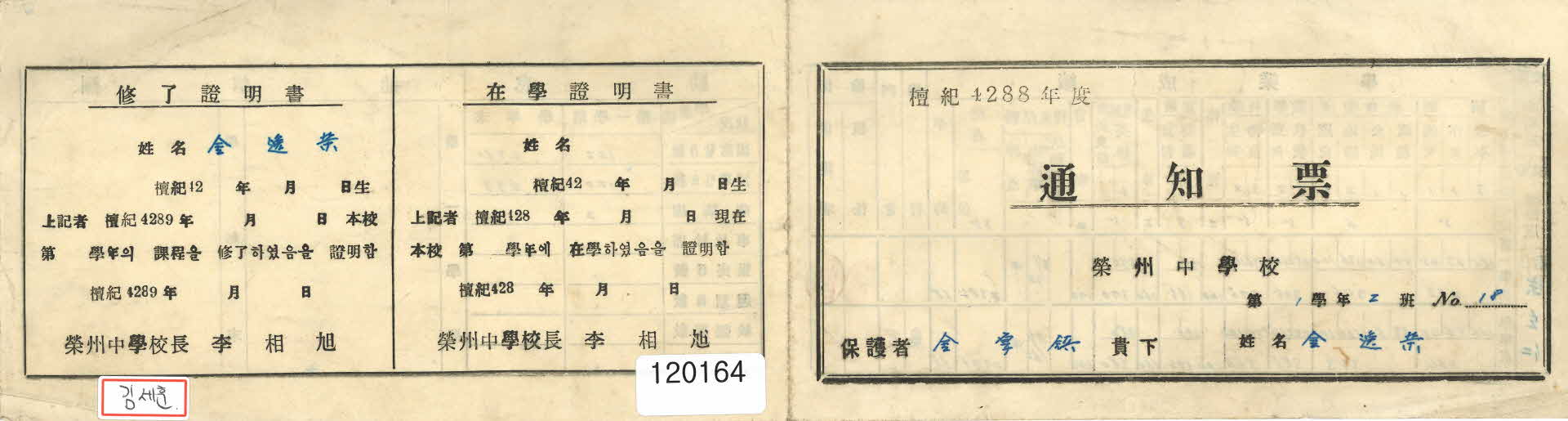 | 기록물명 | 영주중학교 김일영 통지표 | ||