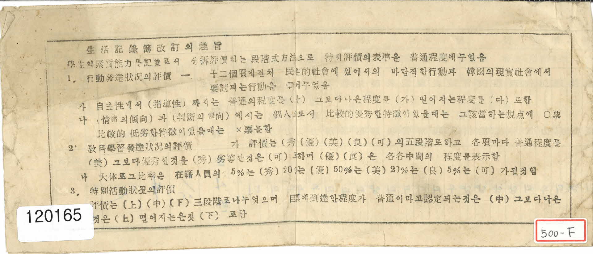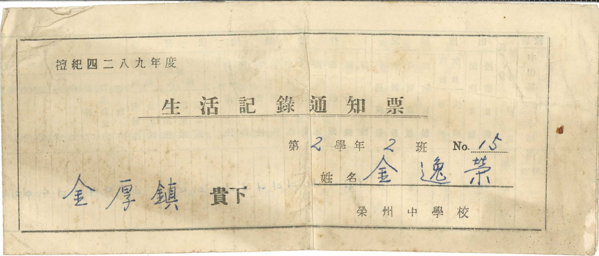 이 생활기록통지표(生活記錄通知票)는 1956년 영주중학교 제2학년 2반 15번 김일영(金逸榮) 학생에게 발급한 것이다. 이 통지표는 출석상황, 행동발달상황, 교과학습 발달상황, 특별활동 등으로 평가하였다. 당시 교과목은 국어(작문, 독해력, 청취력, 구술발표력), 사회생활(역사, 지리, 공민, 도의), 수학(기능, 태도, 이해), 사생(기능, 태도, 이해), 과학(기능, 태도, 이해),체육(습관, 기능, 태도, 이해), 음악(이해, 표현, 감상), 미술(이해, 표현, 감상), 실업(이해, 태도, 기능), 선택교과(영어 : 서사력, 독해력, 회화력, 청취력) 등이었다. 또한 당시 교장은 이상욱(李相旭)이고, 교감은 이원윤(李源胤), 담임은 김변룡(金釆龍)이었다. 또한 이 통지표에는 생활기록부(生活記錄簿) 개정(改訂)의 취지(趣旨)가 수록되어 있다.
