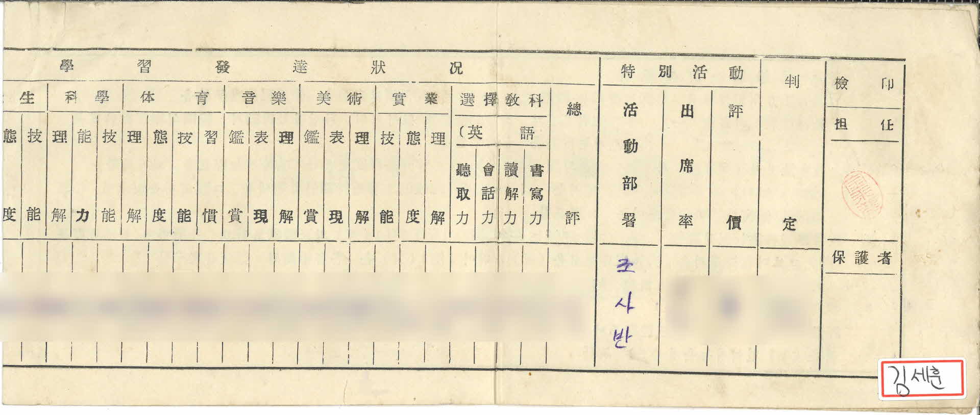 영주중학교 김일영 생활기록통지표