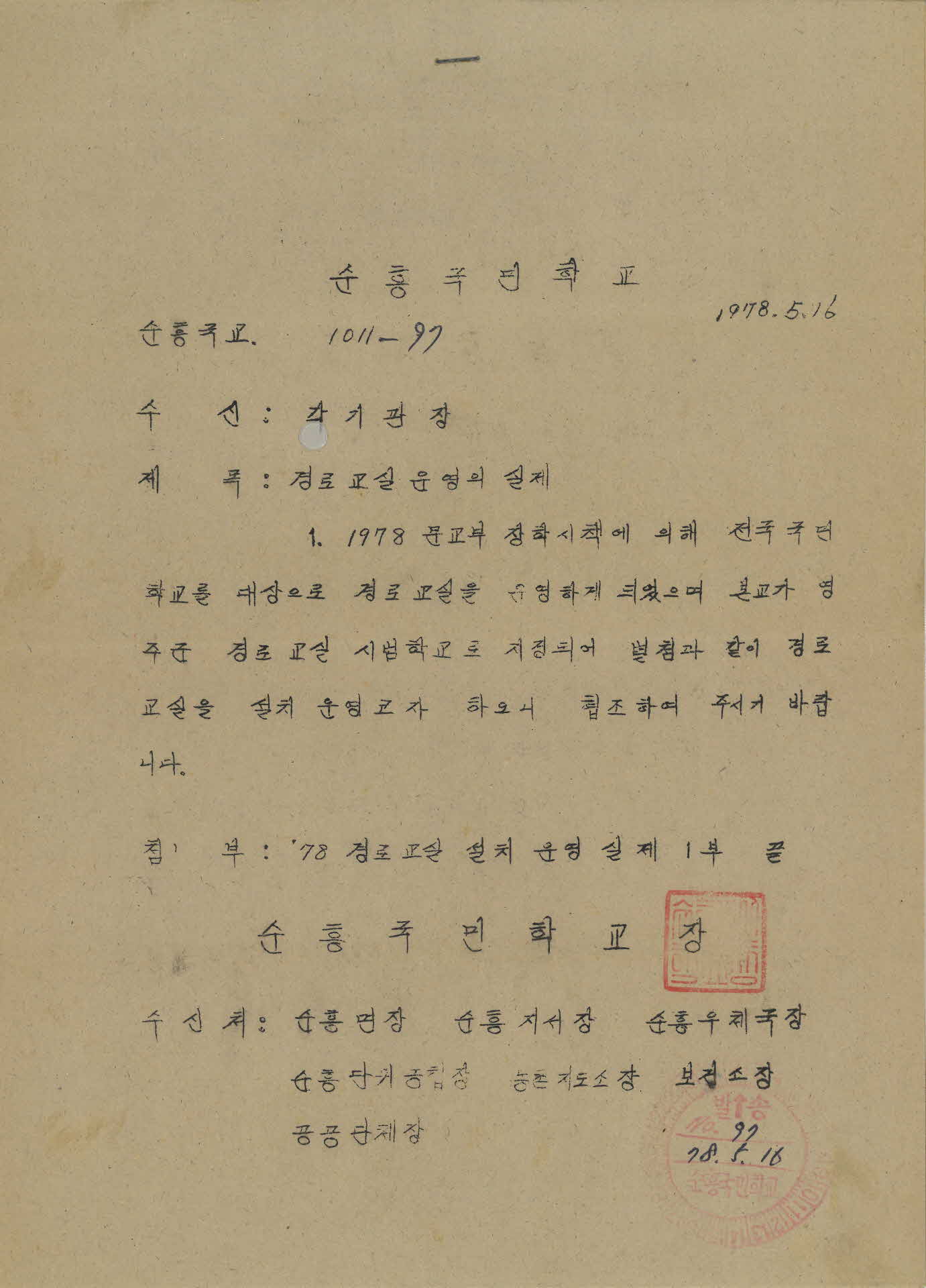 1978516일 순흥국민학교가 발행한 순흥국민학교의 경로교실 운영의 실제에 관한 기록이다. 분량은 5쪽이며, 기록형태는 등사본이다. 당시 경로교실 운영은 1978년 문교부 장학시책에 의해 전국 국민학교가 시행하게 되어 있었다. 수신처는 순흥면장, 순흥지서장, 순흥우체국장, 순흥단위농협장, 농촌지도소장, 보건소장, 공공단체장 등이었다.