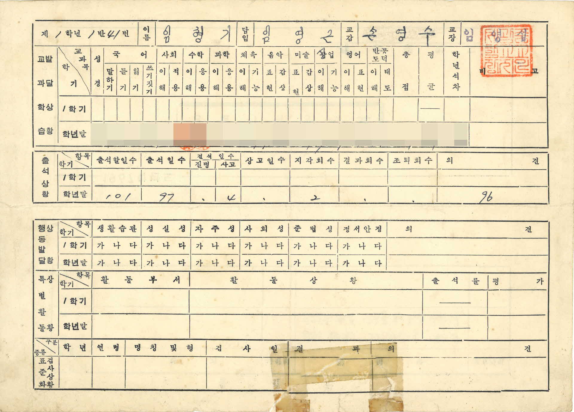 1968년 세광중학교 명의로 1학년 1반 임형기 학생의 보호자 임명진에게 보낸 생활기록통지표이다. 4면으로 구성된 통지표는 교과 학습 발달 상황, 출석 상황, 행동발달 상황, 특별활동 상황 등으로 구성되어 있다.
