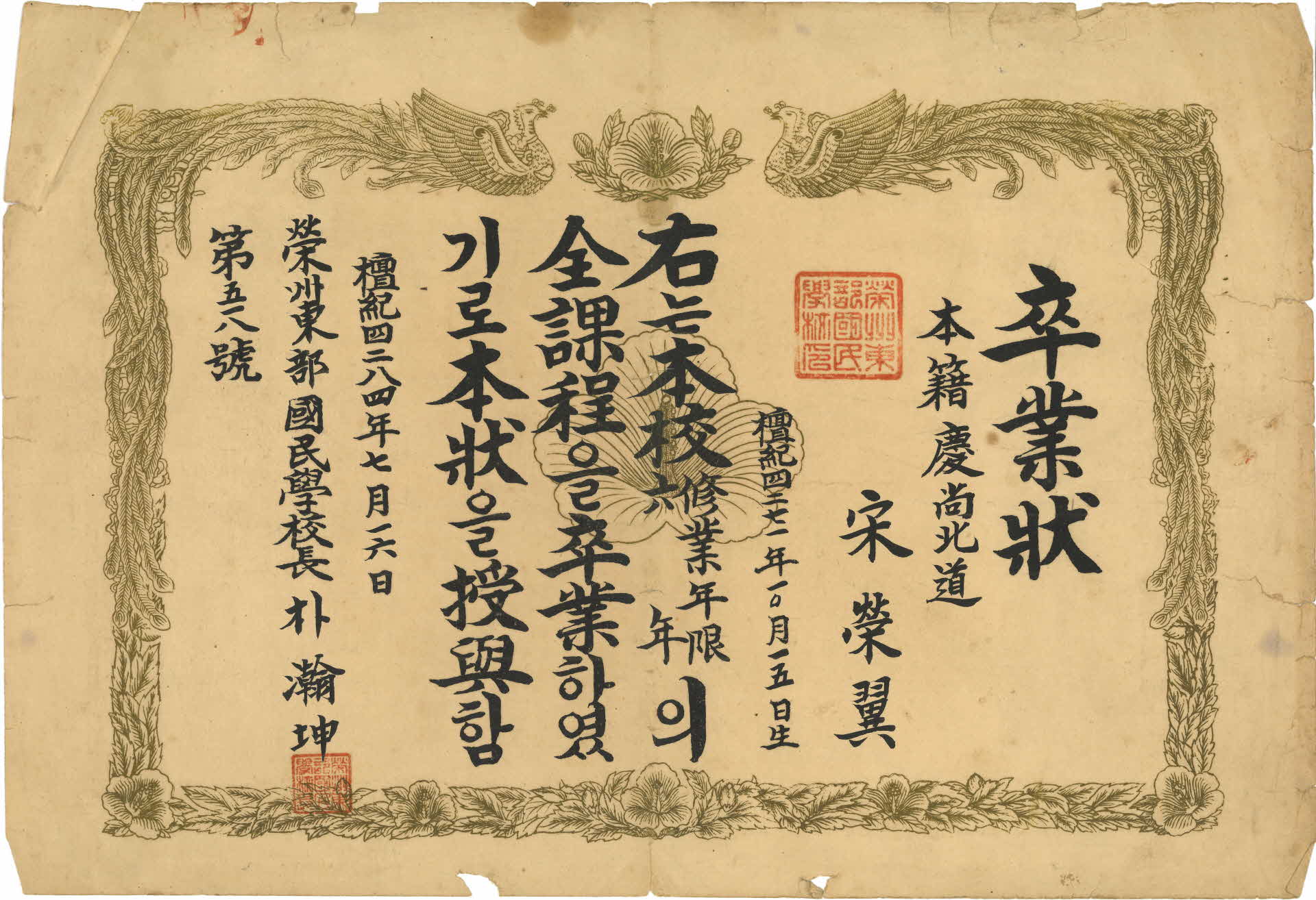 1951년 영주동부국민학교의 송영익(宋榮翼) 졸업장이다. 동부국민학교는 1940년 6월 1일 영주동부공립심상소학교로 개교해 1941년 4월 1일 영주동부국민학교로 개칭되었다. 1994년 3월 운문국민학교 폐교로 통폐합되었고, 1996년 3월 1일 영주동부초등학교로 개칭되었다. 6·25전쟁 중 국민학교 졸업장의 형태를 파악할 수 있는 기록물이다.