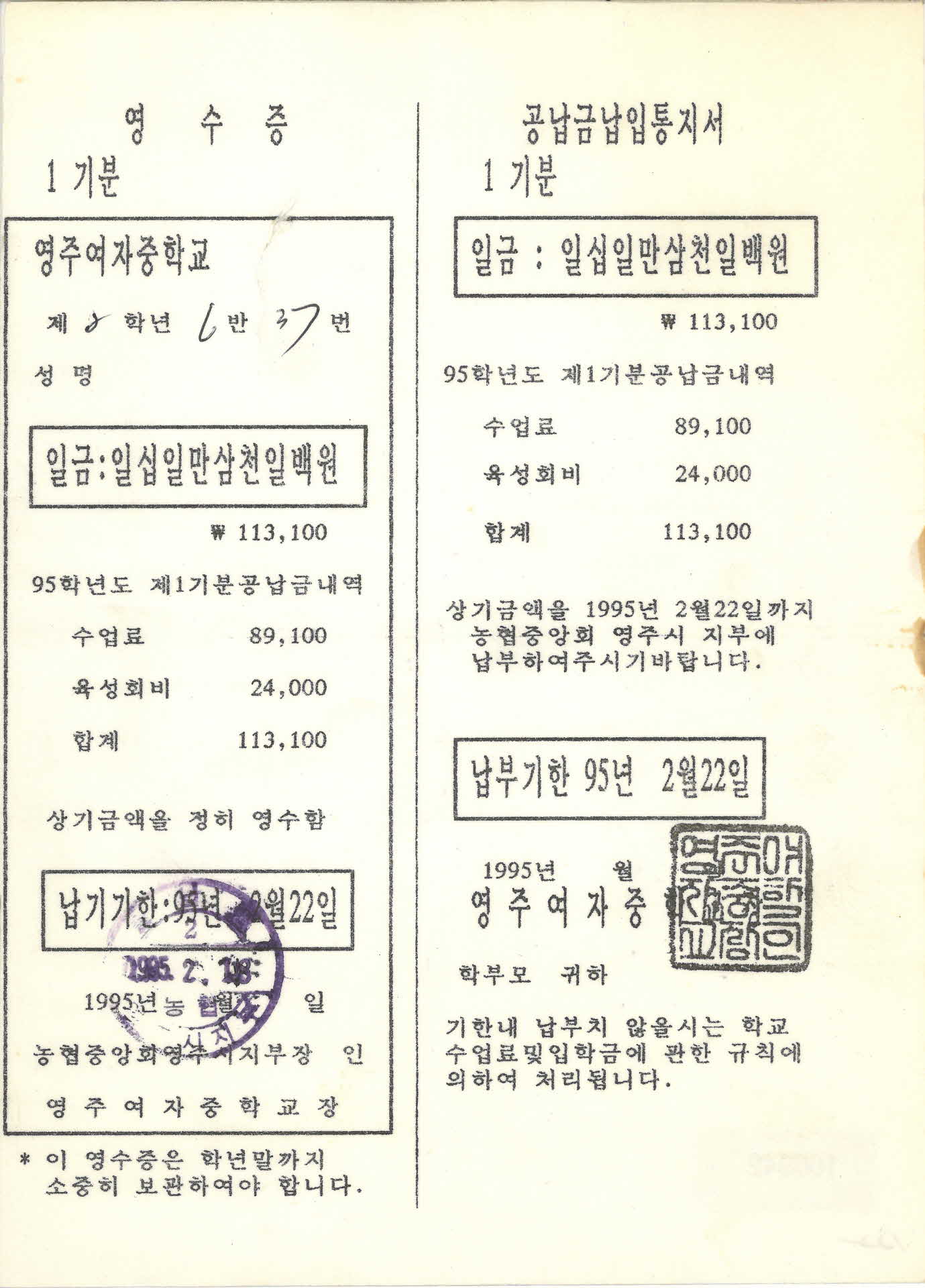 1995년 영주여자중학교의 재학생에게 발부한 1기분 공납금납입통지서이다. 납부기한은 1995년 2월 22일이며, 공납금은 113,100원이었다. 중학교 의무교육이 전면적으로 시행되기 전 중학생들의 공납금 납입 상황을 파악할 수 있는 기록물이다. 중학교 의무교육 전면 실시 이전의 중학생들은 운영지원비와 수업료가 모두 본인 부담이었기에 비싼 수업료를 냈다. 참고로 2004년에 전면적인 중학교 의무교육이 확대 실시되었다.