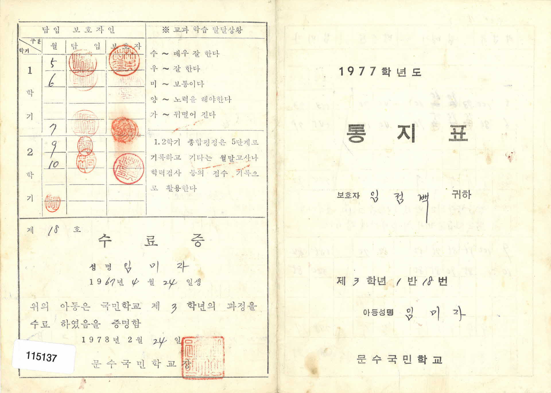 이 통지표(通知表)는 1977년 문수국민학교(文殊國民學校) 제 3학년 1반 임미자 학생에게 발급한 것이다. 당시 통지표는 교과 학습 발달 상황 성적들과 행동 발달 상황, 특별 활동 상황들이 1학기 2학기로 나뉘어 기입되어 있고 출석 상황, 신체 발달 상황들도 기입되어 있다. 또한 이 통지표(通知表)에는 담임, 보호자인과 제18호 수료증(修了證)이 수록되어 있다.