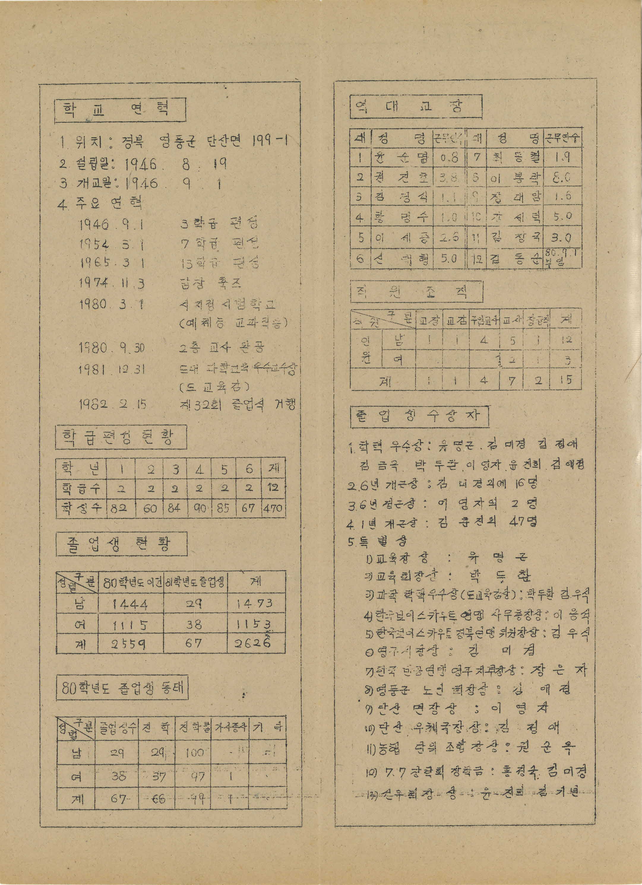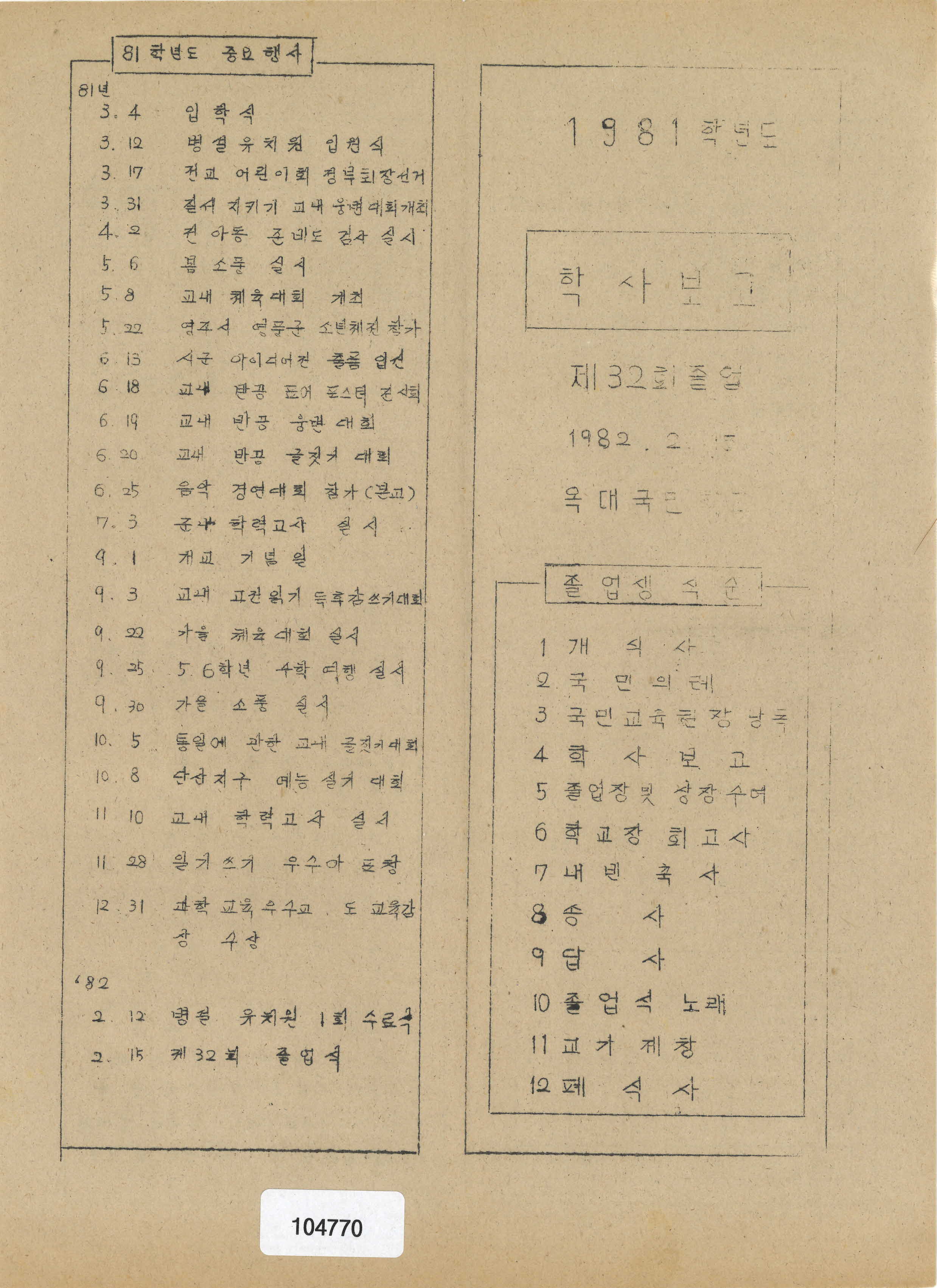 1981년 2월 15일 옥대국민학교 제32회 졸업식 때 배부된 학사보고이다. 16절지 갱지에 앞뒤로 등사 인쇄되었고, 한 면에 2단으로 인쇄되었다. 학사보고는 졸업생 식순, 학교 연혁, 학급편성 현황, 졸업생 현황, 80학년도 졸업생 동태, 역대 교장, 직원 조직, 졸업생 수상자, 81학년도 중요행사 등으로 구성되어 있다.