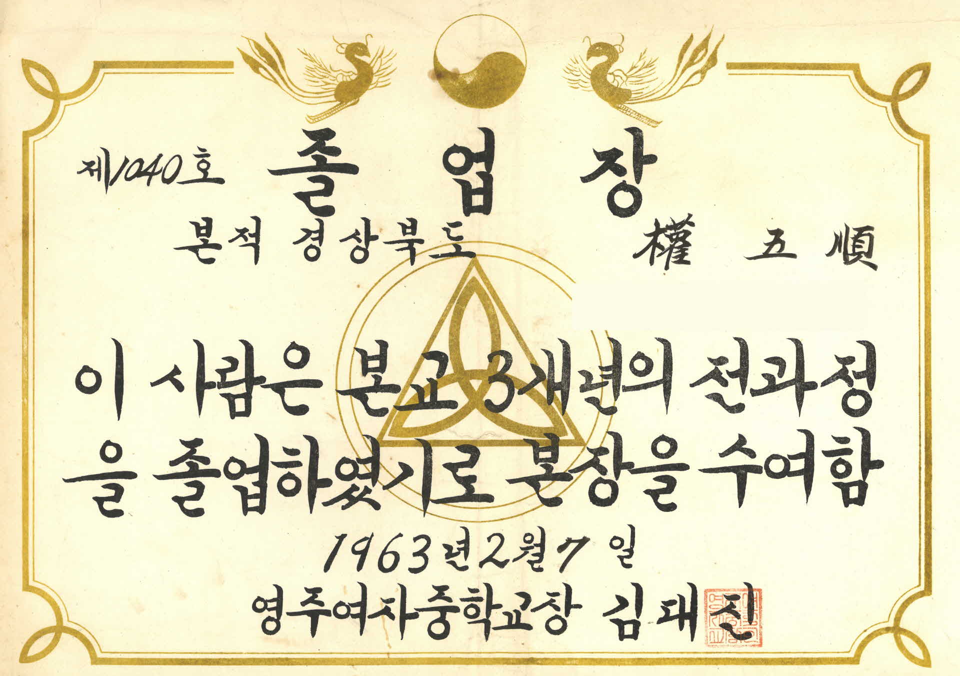 이 졸업장(卒業狀)은 증서 번호 제1040호로 영주여자중학교장(榮州女子中學校長) 김대진이 1963년 2월 7일 졸업생인 권오순(權五順) 학생에게 발급한 것이다. 수업연한(修業年限)은 3년이고, 졸업장에는 본적과 생년월일이 기록되어 있다.