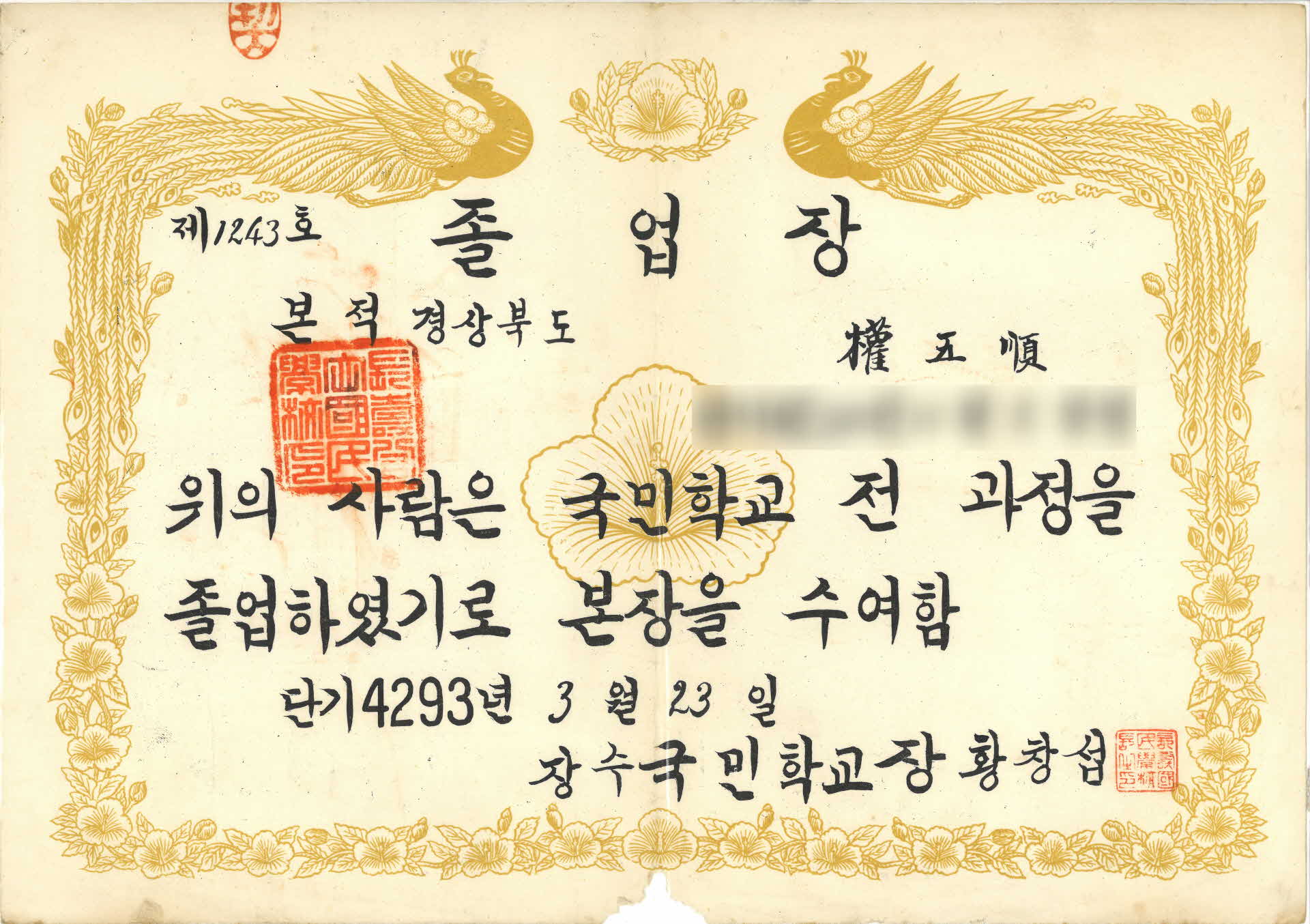 이 졸업장(卒業狀)은 증서 번호 제1243호로 영주장수국민학교장(榮州長壽國民學校長) 황창섭이 1960년 3월 23일 졸업생인 권오순(權五順) 학생에게 발급한 것이다. 수업연한(修業年限)은 6년이고, 졸업장에는 본적과 생년월일이 기록되어 있다.