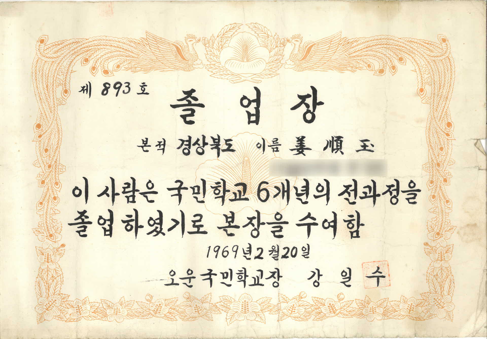 이 졸업장(卒業狀)은 증서 번호 제893호로 평은 오은국민학교(梧云國民學校) 강일수가 1969년 2월 20일 졸업생인 강순옥(姜順玉) 학생에게 발급한 것이다. 수업연한(修業年限)은 6년이고, 졸업장에는 본적과 생년월일이 기록되어 있다.