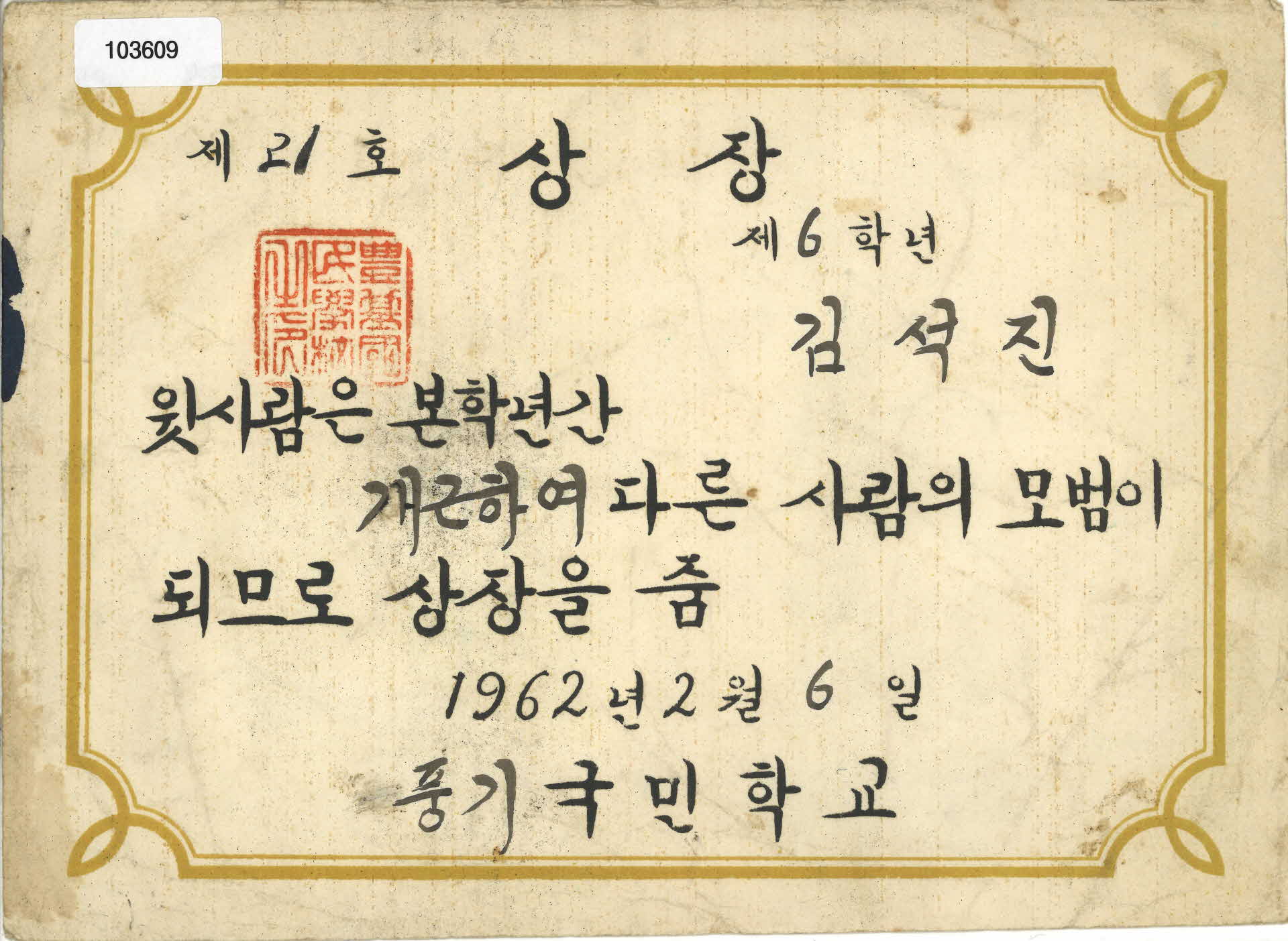 이 상장(賞狀)은 증서 번호 제21호로 풍기국민학교(豐基國民學校)에서 1962년 2월 6일 6학년 김석진 학생에게 발급한 1년 개근(皆勤) 상장이다.