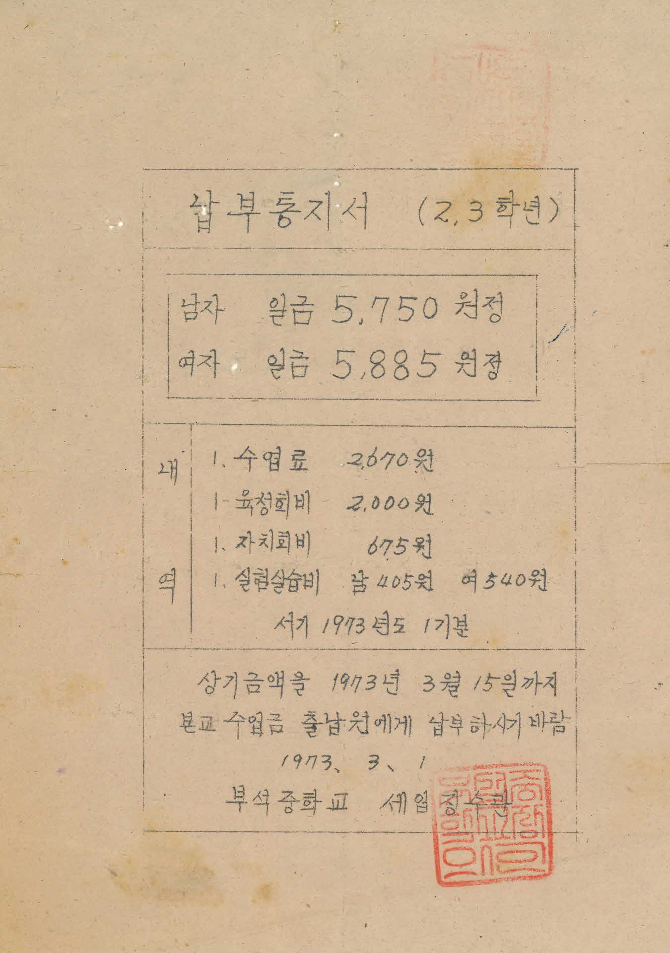 이 납부통지서(納付通知書)는 1973년 3월 1일 부석중학교(浮石中學校) 세입징수관이 발급한 서류로 73년 1분기 수업료 등을 3월 15일까지 납부해 달라는 통지서이다. 당시 내역을 보면 수업료가 2, 670원, 육성회비가 2,000원, 자치회비가 675원, 실험실습비(남자 405원, 여자 540원)으로 총 남자 5,750원, 여자 5,885원이었다.
