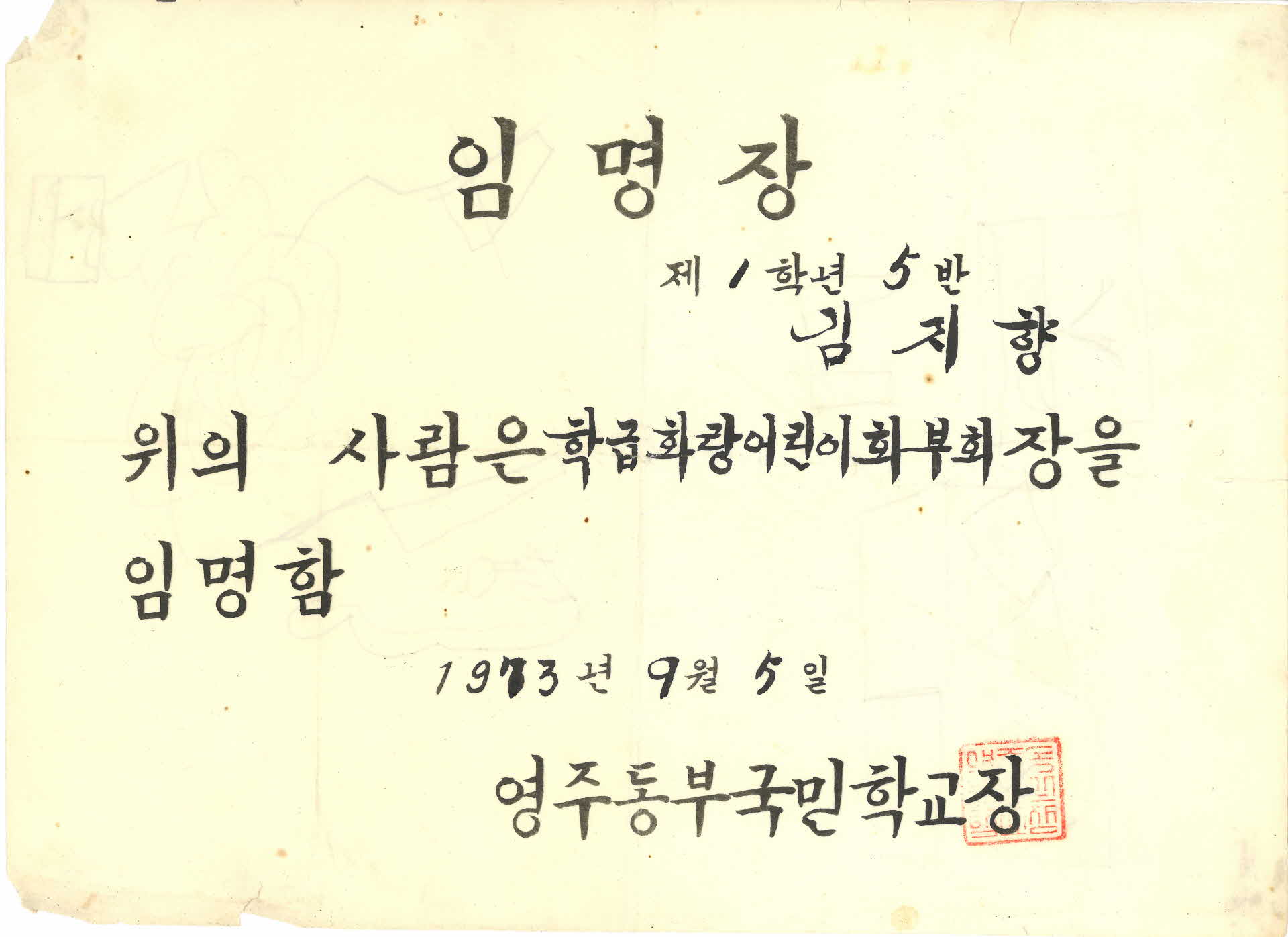 이 임명장(任命狀)은 1973년 영주동부국민학교장(榮州東部國民學校長)이 1학년 5반 학급 화랑어린이 부회장으로 김지향 학생을 임명하면서 발급한 것이다.