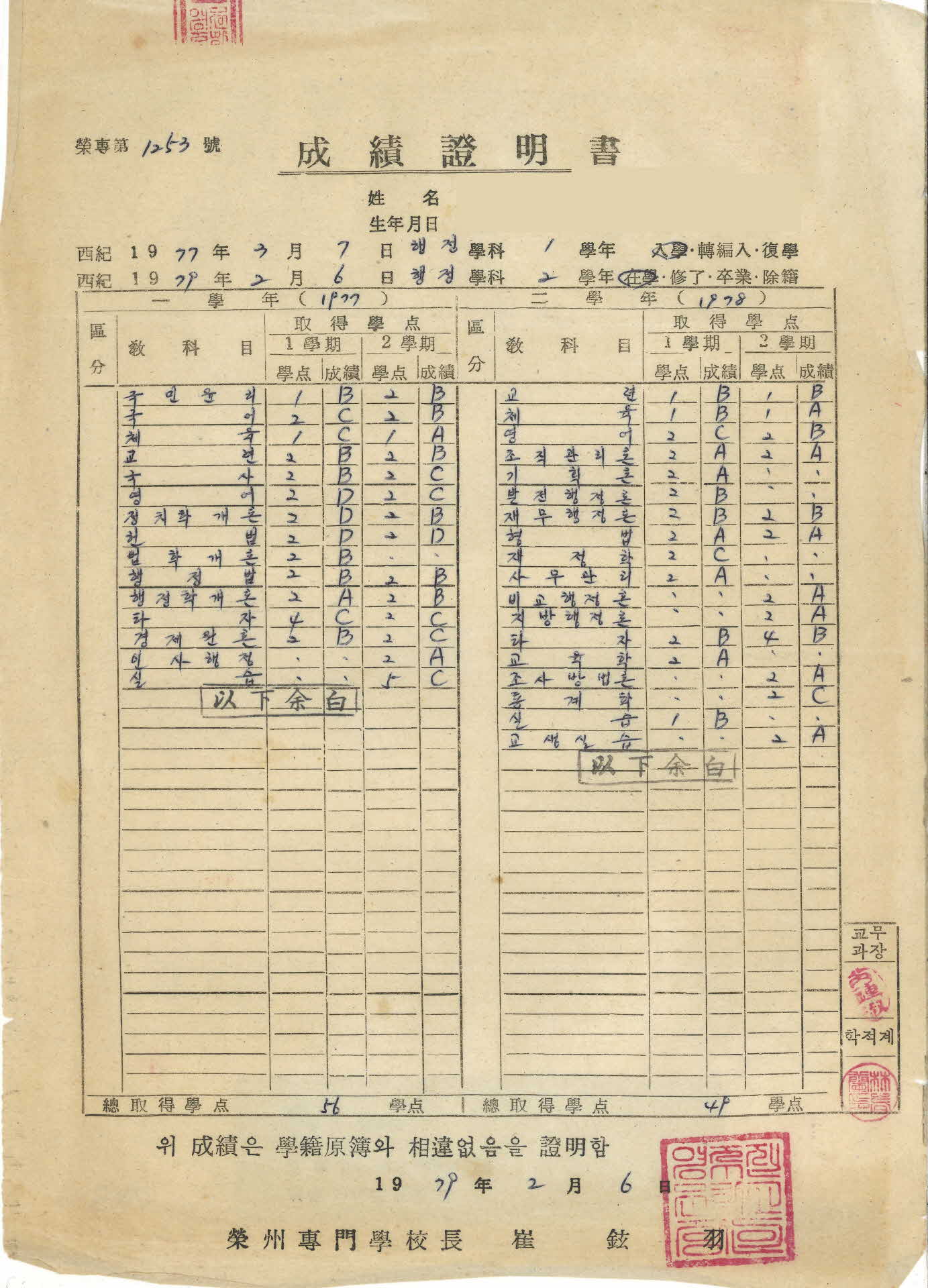 이 성적증명서(成績證明書)는 영주전문학교장(榮州專門學校長)인 최현우가 1979년 2월 6일 행정학과 2학년에 재학중인 학생에게 발급한 것이다.