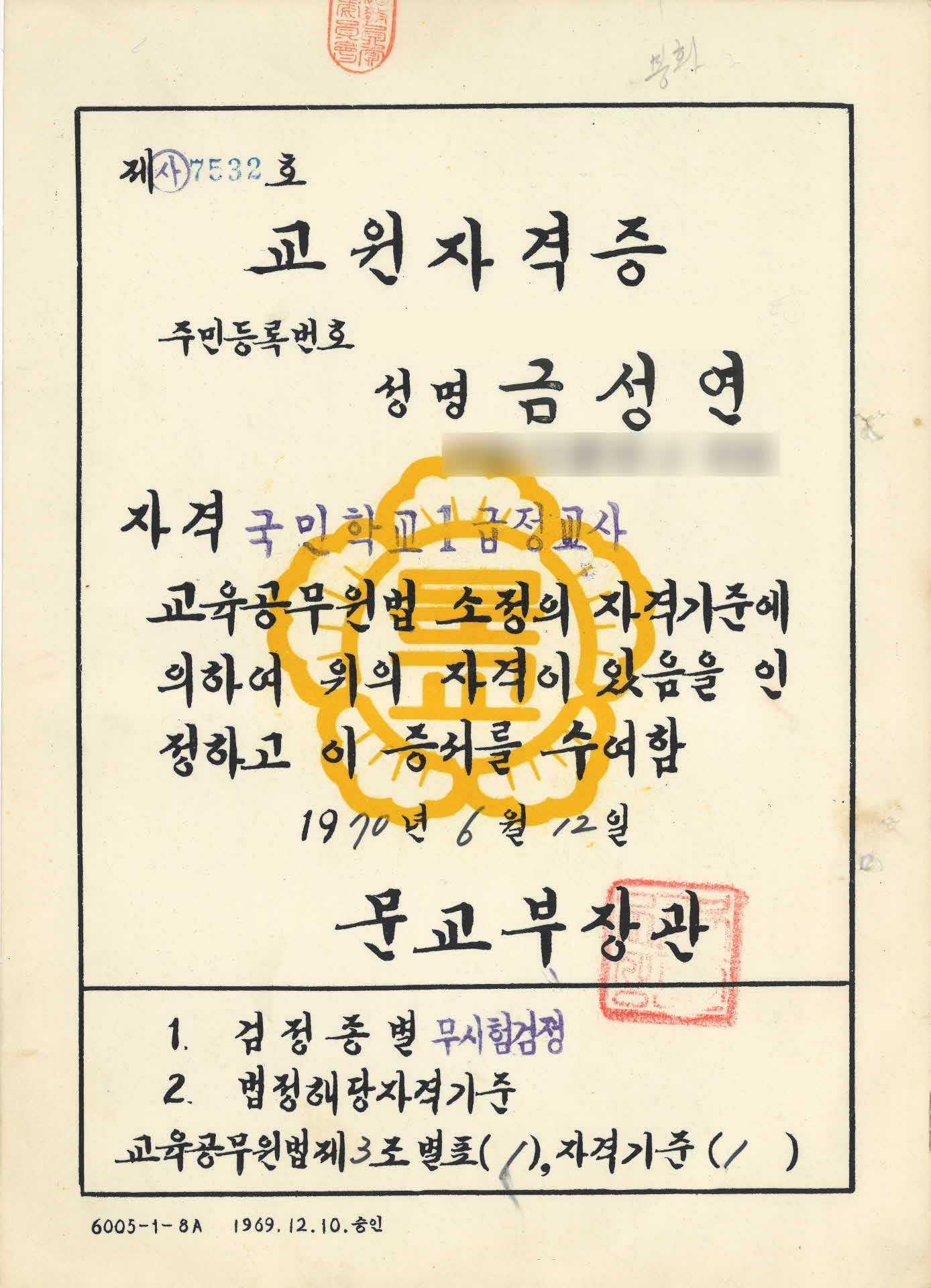 이 교원자격증(敎員資格證)은 문교부 사 7532호로 문교부장관(文敎部長官)이 1970년 6월 12일 교육공무원법의 소정의 자격(국민학교 1급 정교사)을 갖춘 금성연에게 발급한 것이다.
