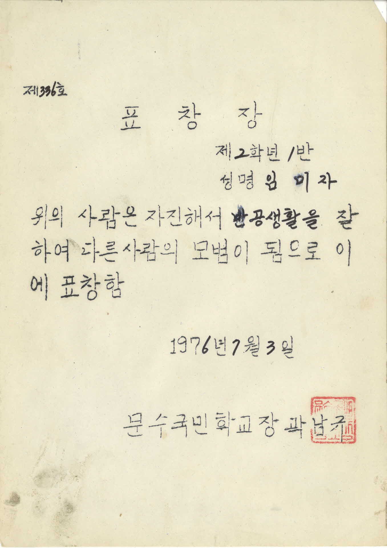 1976년 7월 3일 반공생활에 참여한 2학년 1반 임미자 학생에게 발급한 것이다.