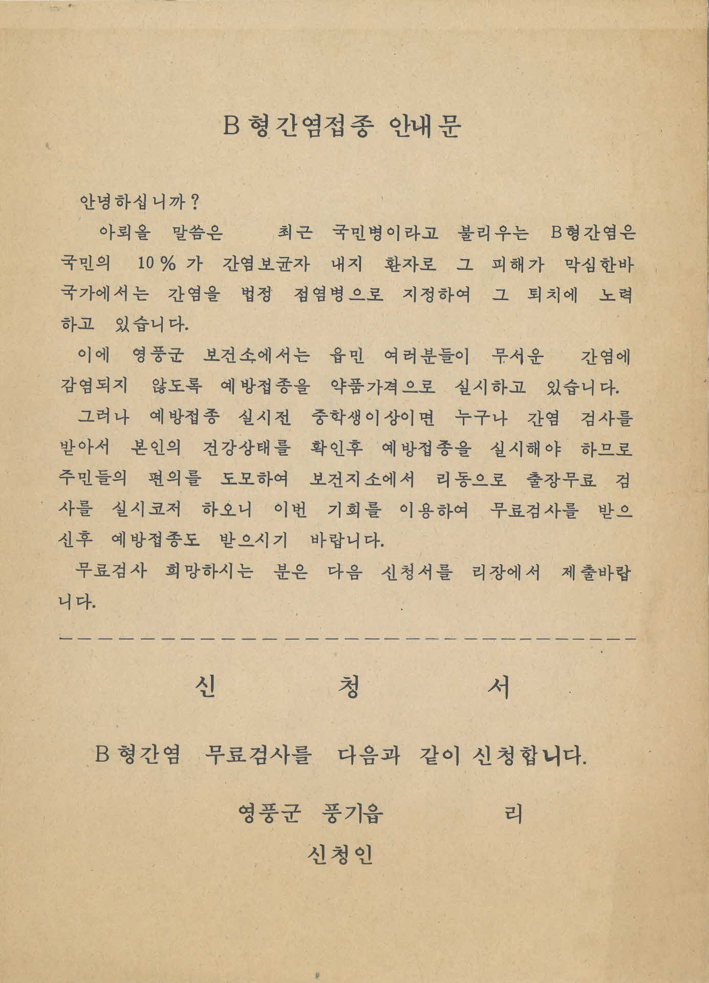 영풍군보건소가 발행한 B형 간염접종 안내문이다.