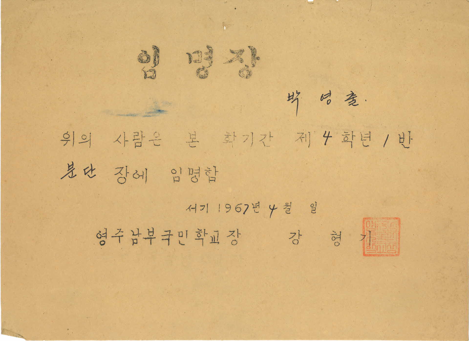 이 임명장은 1967년 4월 영주남부국민학교장 강형기가 4학년 1반 분단장(分團長)에 임명된 박영출 학생에게 발급한 것이다. 분단장은 초등학교 교실에서 분단의 학생들을 대표하는 학생이다.