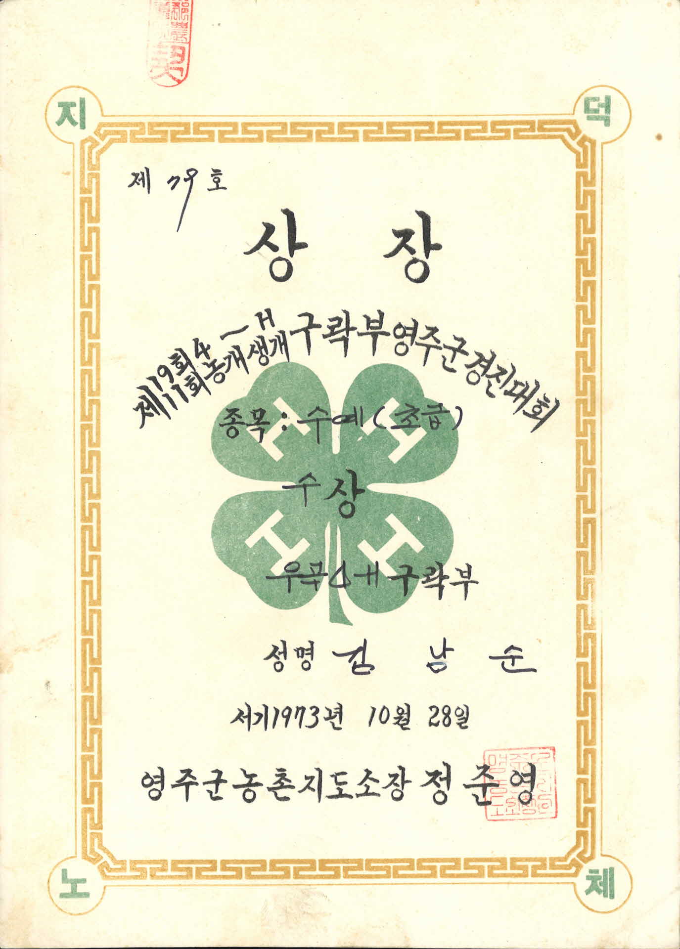 이 김남순 상장은 1973년 10월 28일 영주군농촌지도소장인 정준영이 우곡 4-H구락부 김난순에게 발급한 것이다. 내용은 제19회 4-H 농개생개 구락부 영주군경진대회에서 수예종목 초급에서 수상한 김난순에게 상장을 수여했다는 것이다. 발급번호는 79호이다.