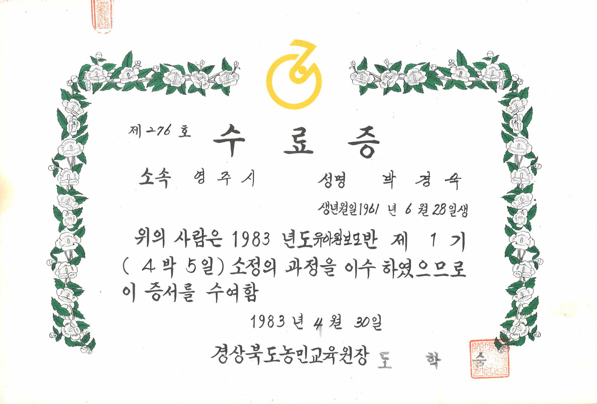 이 박경숙 유아원보모반 수료증은 1983년 4월 30일 경상북도 농민교육원장 도학술이 영주시에 거주하고 있는 박경숙에게 발급한 것이다. 내용은 1983년 도 유아원 보모반 제1기(4박 5일)의 소정의 과정을 마쳤다는 것이다. 발급번호는 276호이다.