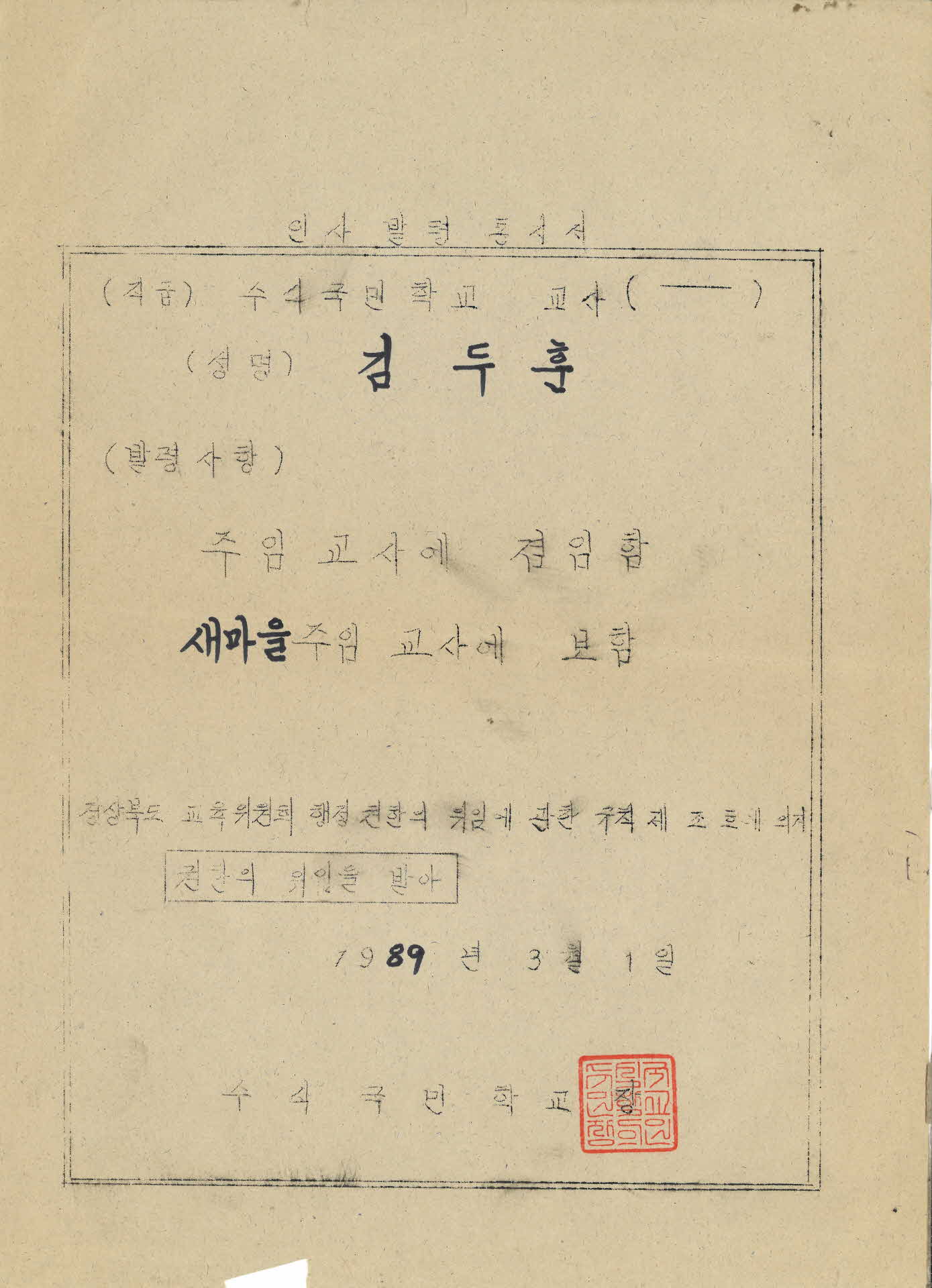 이 인사발령 통지서는 1989년 3월 1일 수식국민학교장이 김두훈 교사를 경북 교육위원회 행정 권한의 위임에 관한 규칙에 의하여 주임교사에 겸해 새마을 주임교사에 보하면서 발급한 것이다.