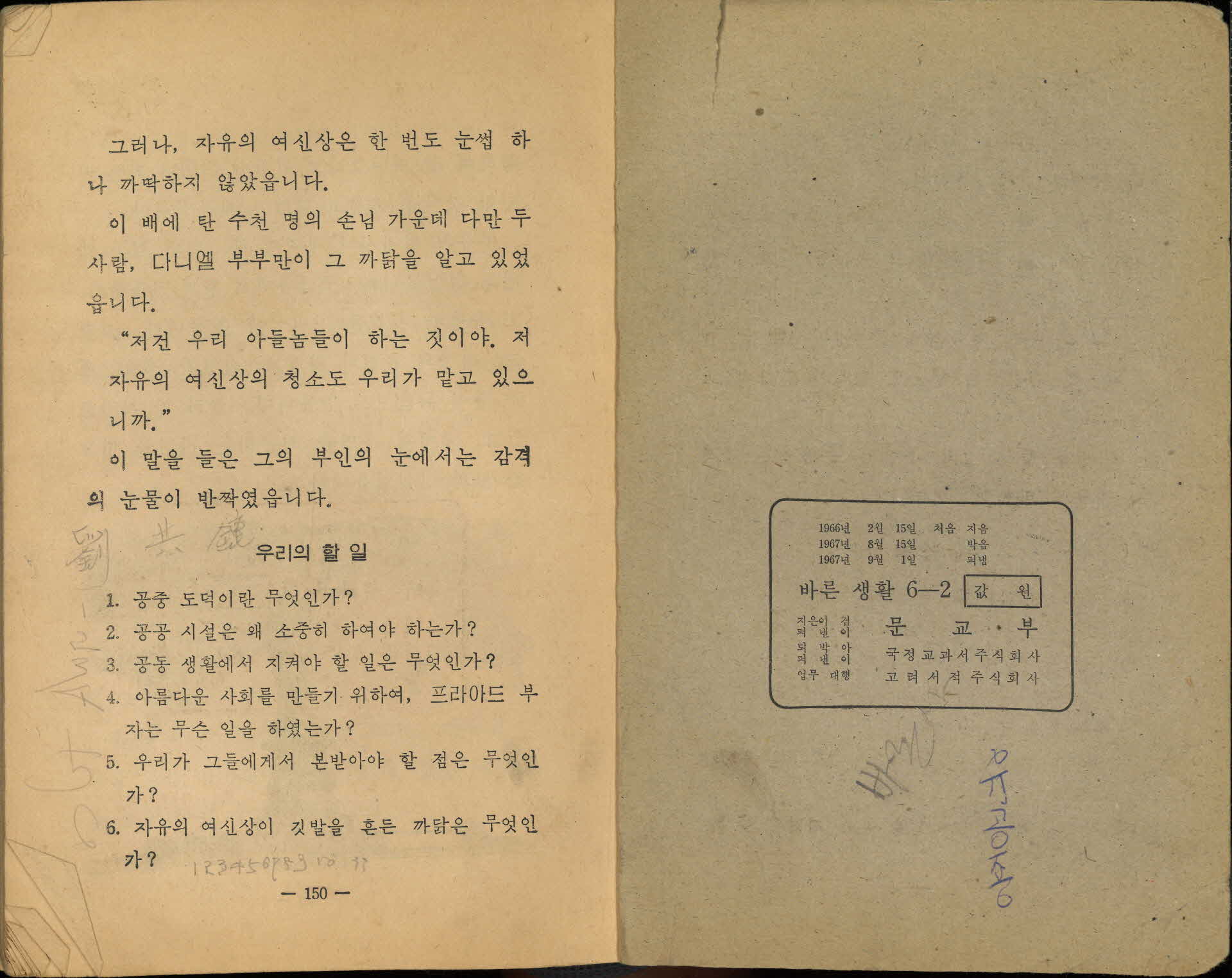 이 국민학교 6학년 2학기 『바른생활』 교과서는 제2차 교육과정기(1963.2.∼1973.2.)기인 1966년 2월에 문교부에서 짓고 펴낸 것을 1967년 9월에 다시 국정교과서주식회사에서 펴낸것이다. 업무대행은 고려서적주식회사였다. 제2차 교육과정기인 1963년 2월 15일에 개정·공포된 초등학교 교육과정(문교부령 제119호)기에는 ‘생활 중심 교육과정’을 표방하였다. 1970학년도부터 초등학교 4학년 이상 모든 교과용 도서의 앞표제지와 속표제지 사이에 국민교육헌장 게재로 확대되었다. 제2차 교육과정기의 국정교과서 개편 작업은 1963년부터 1967년까지 계속되었다. 모든 교과서에서 한자를 제거하기도 했다. 초등학교의 신편 교과서는 1963년에 1∼2학년용이 완료되어 1964년부터 사용되었다. 3∼4학년용은 1965년, 그리고 5∼6학년용은 1966년부터 사용되었다. 이 무렵 국정교과서 번각 발행사로는 국정교과서주식회사(초등학교용), 대한교과서주식회사, 고려서적주식회사, 동아서적주식회사(이상 중·고등학교용)의 4개사 체제였다.