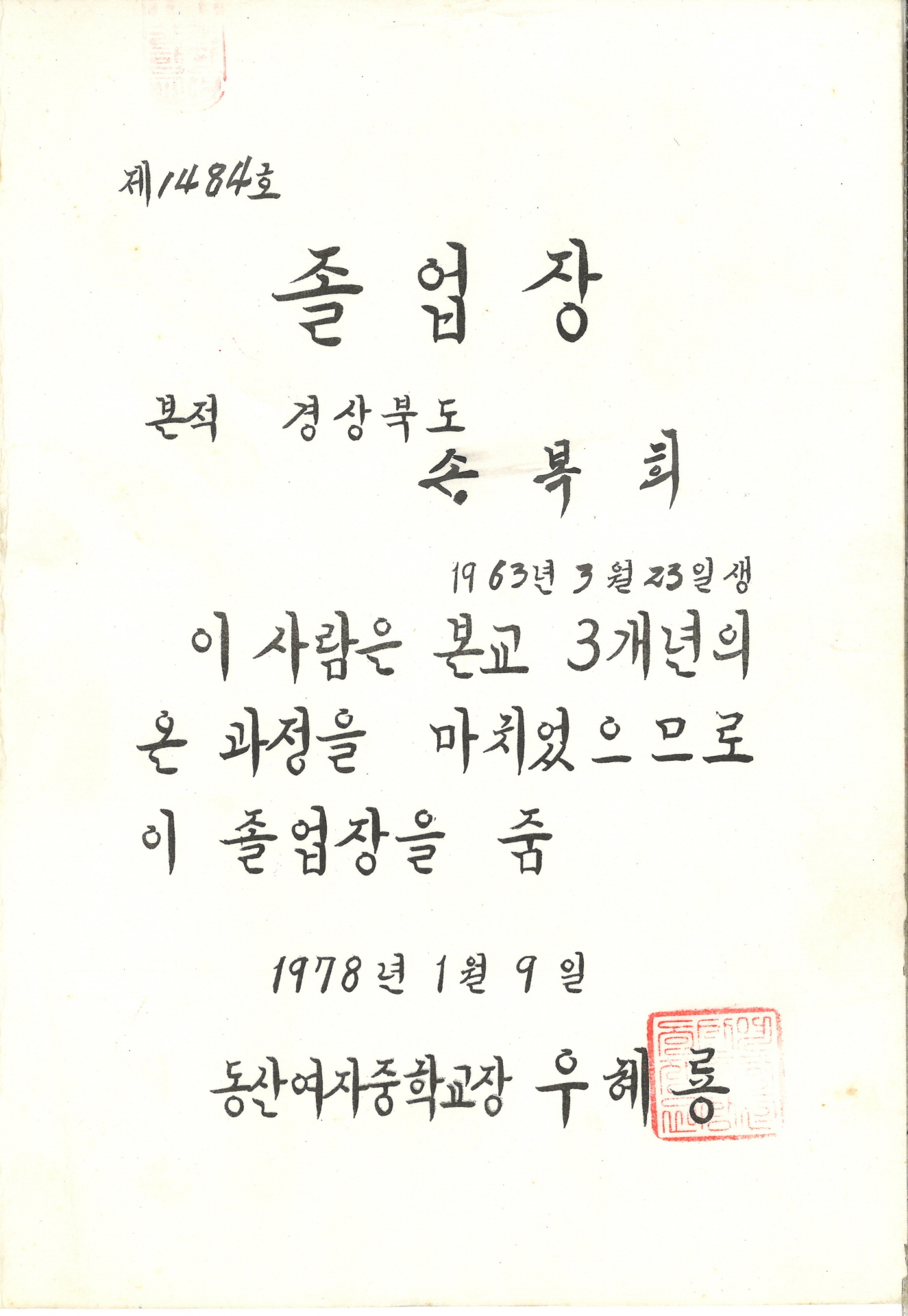이 졸업장(卒業狀)은 동산여자중학교 우혜룡 교장이 1978년 1월 9일 제6회 졸업생인 손복희 학생에게 발급한 것이다.
