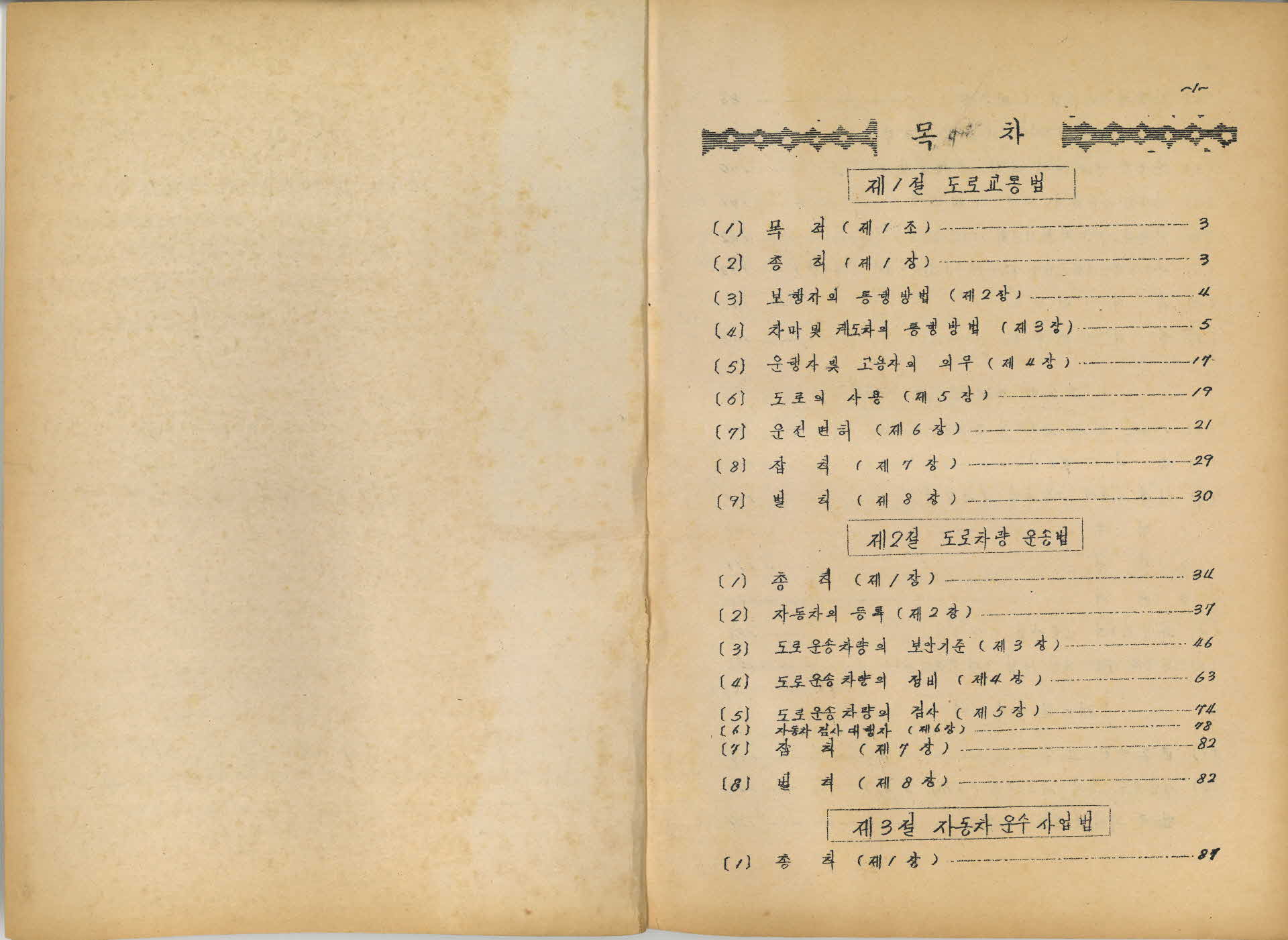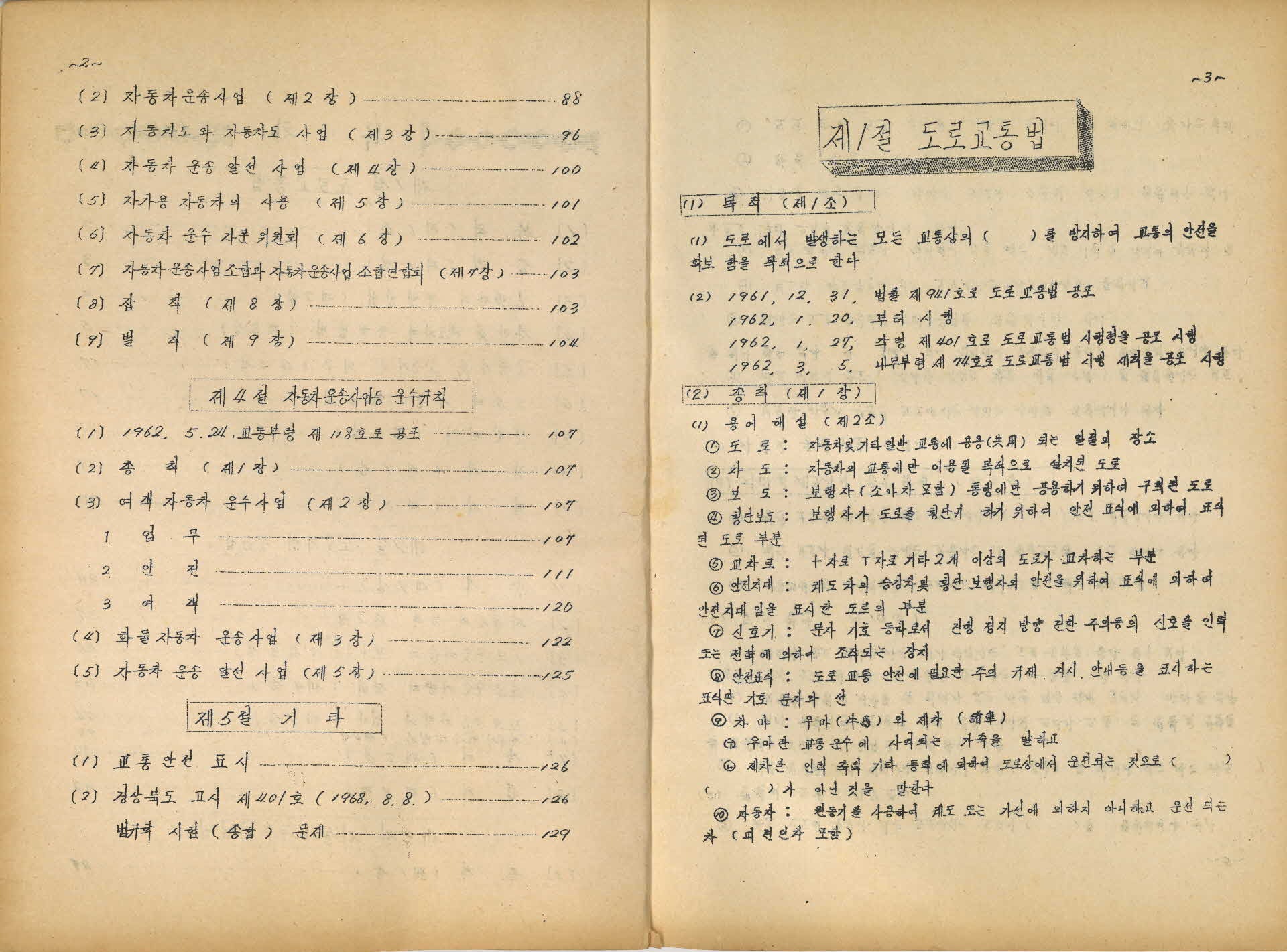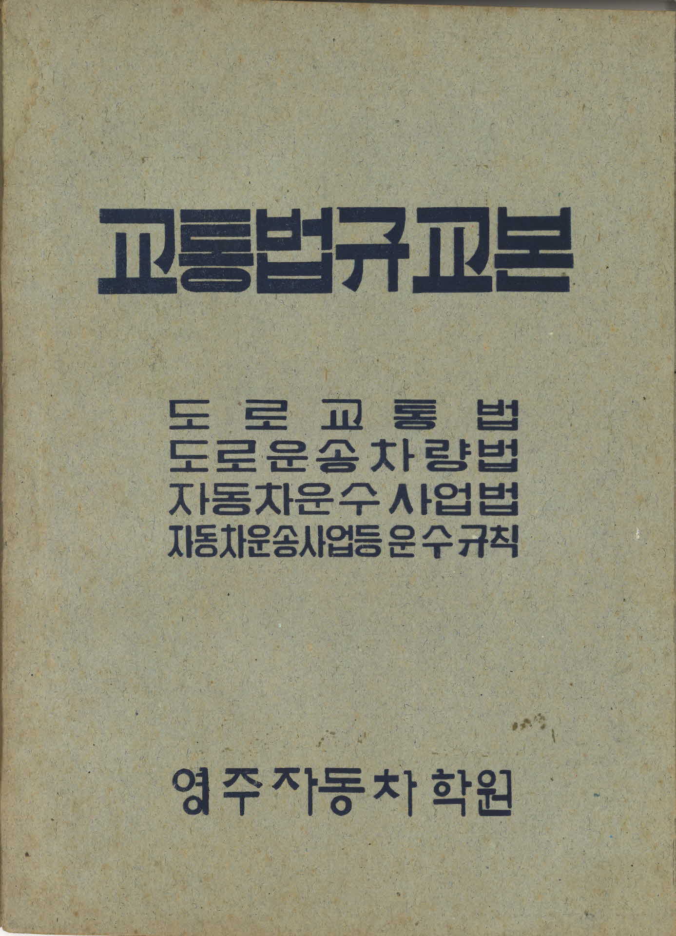 이 교통법규교본(交通法規敎本)은 영주자동차학원에서 발간한 교본으로 5절로 편집되어 있다. 내용을 보면 1절 도로교통법, 2절은 도로차량운송법, 3절은 자동차운수사업법, 4절은 자동차운송사업 등 운수규칙, 5절은 기타로 구성되어 있다. 총 15페지이고 발간연대는 60~80년대이다.
