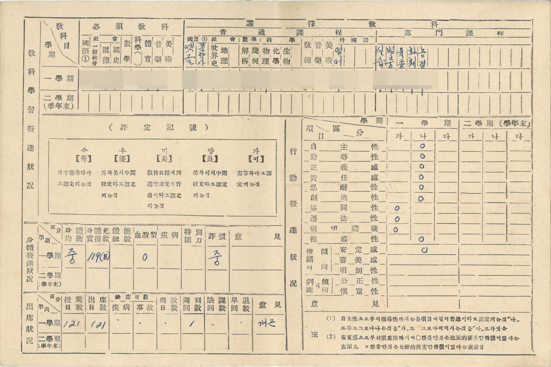 이 통지표에는 교과학습 발달상황, 행동 발달 상황, 특별활동 상황, 신체 발달 상황, 출석 상황, 통신란 등이 기재되어 있다.