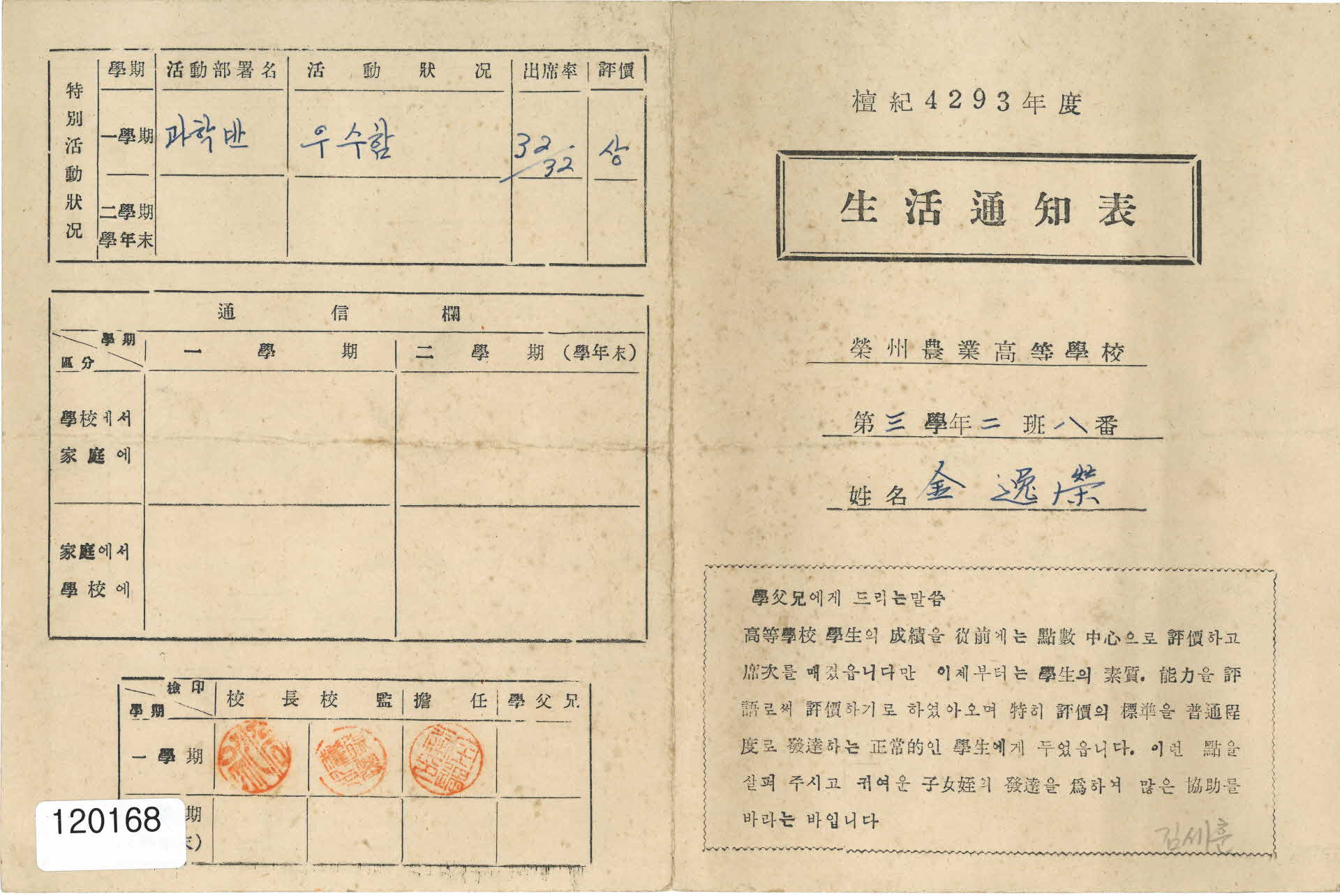 | 기록물명 | 영주농업고등학교 김일영 생활통지표 | ||