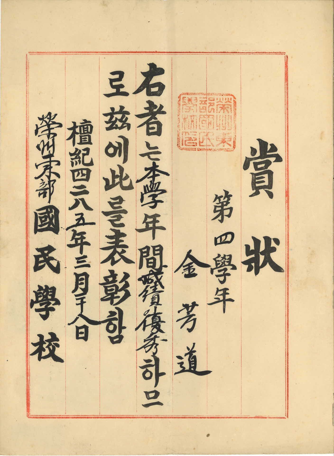이 상장(賞狀)은 영주동부국민학교(榮州東部國民學校)에서 1952년 3월 28일 성적이 우수한 4학년 김방도(金芳道) 학생에게 발급한 것이다.