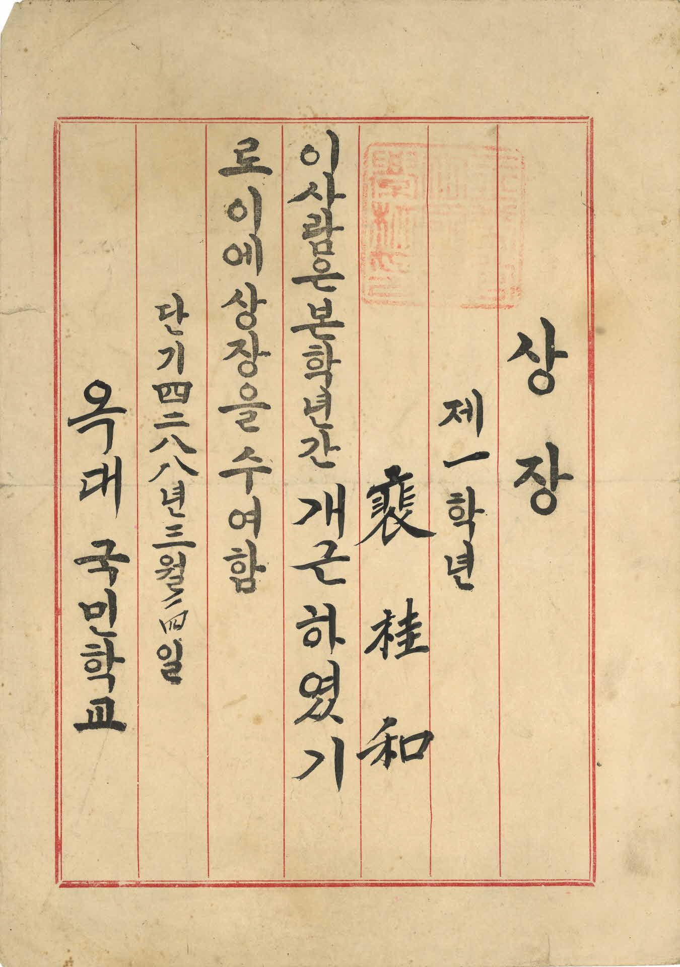 이 상장(賞狀)은 단산 옥대국민학교(玉帶國民學校)에서 1955년 3월 24일 1년 개근(皆勤)한 1학년인 배계화(裵桂和) 학생에게 발급한 것이다.