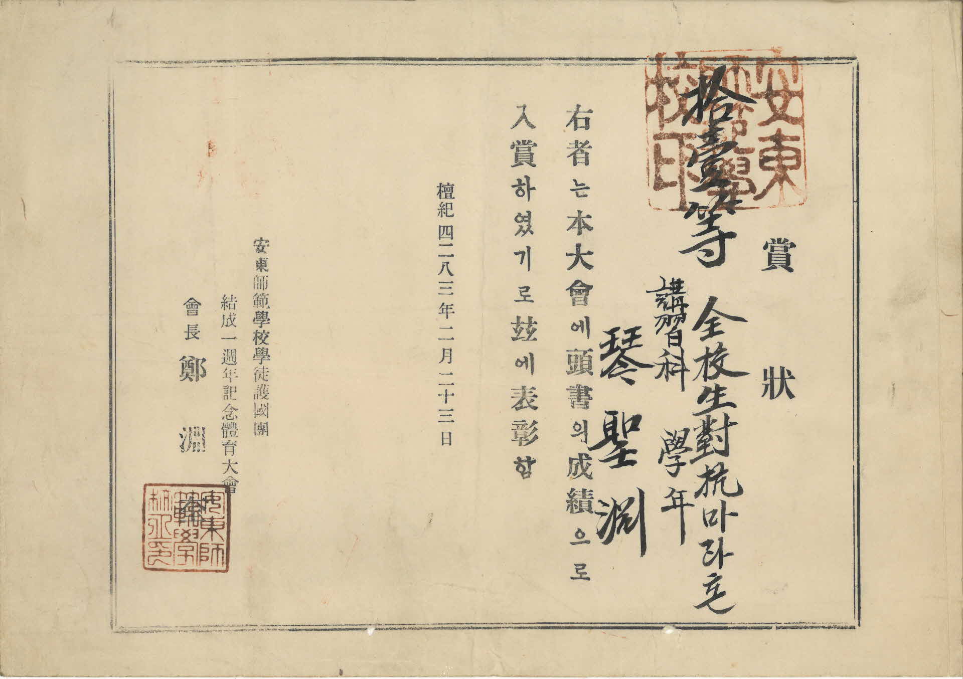 이 상장(賞狀)은 1950년 2월 23일 안동사범학교 학도호국단 결성1주년 기념체육대회 전교생 대항 마라톤대회에서 11등을 한 강습과(講習科) 금성연(琴聖淵)에게 발급한 것이다.