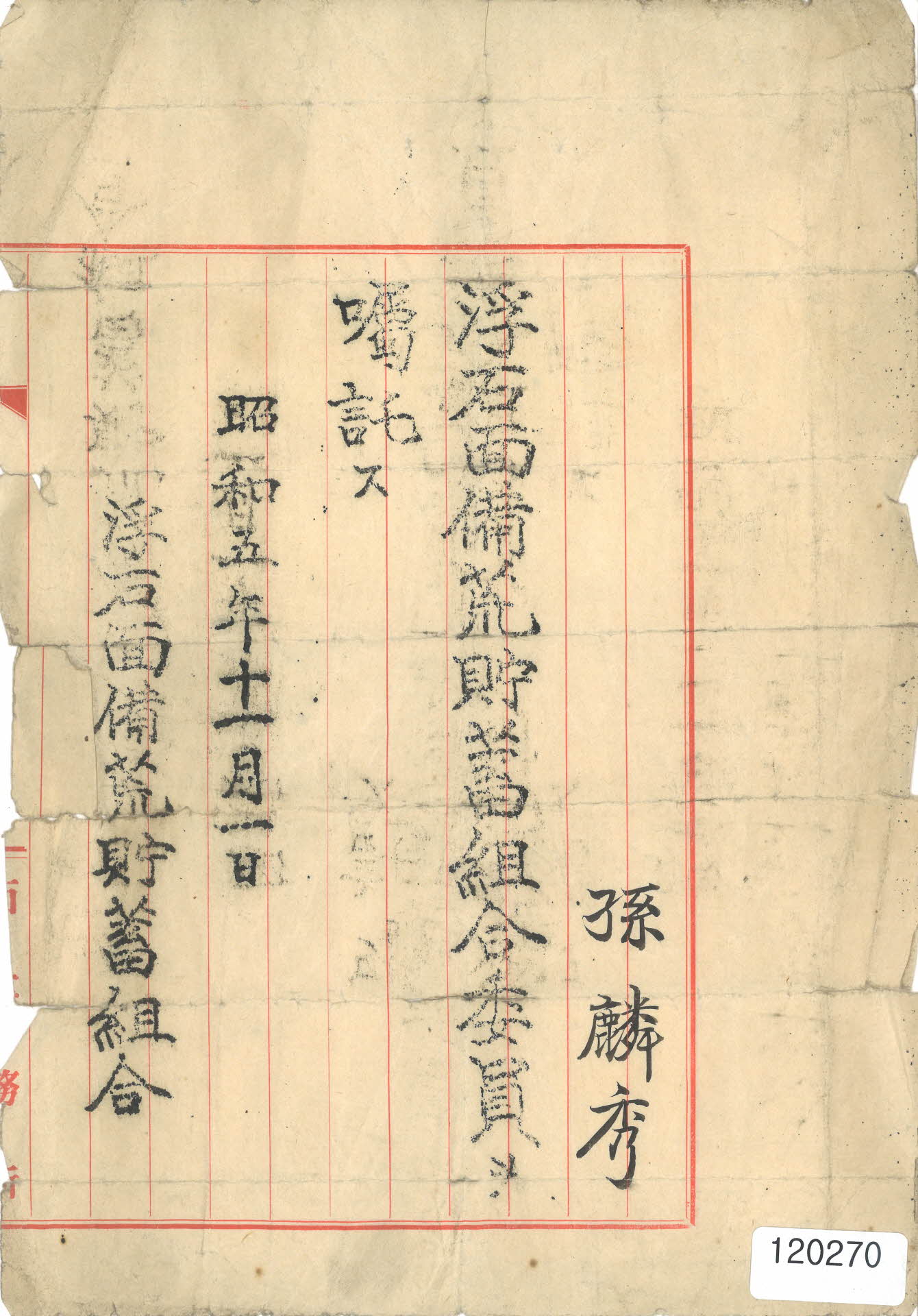 1930년 11월 1일 부석면비황저축조합이 손인수(孫麟秀)를 부석면비황저축조합 위원으로 촉탁하기 위해 발행한 문서이다.