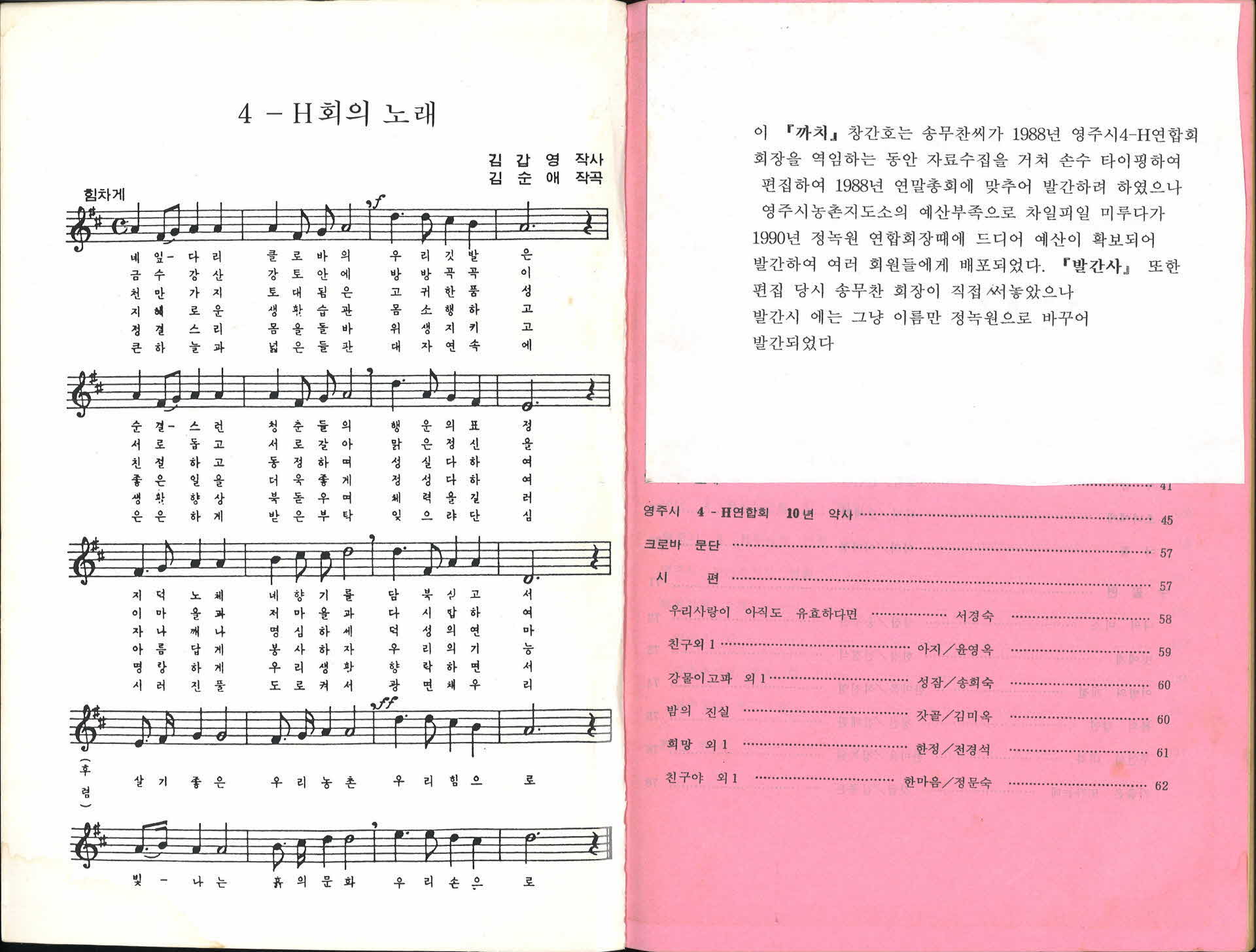 까치창간호는 1990년 영주시 4-H연합회에서 발간한 회지이다. 내용은 4-H운동의 약사 및 크로바의 기초상식, 4-H운동의 의의와 이념, 영주시 소개, 영주시 4-H 10년 역사, 크로바 문단(, 수필, 창작소설), 생활개선, 생활의 지혜, 역대 4-H 회장 근황 및 ‘90 임원, 영주시 4-H 후원회 현황, 영주시농민후계자 현황, 유관기관 소개 등이 수록되어 있다.