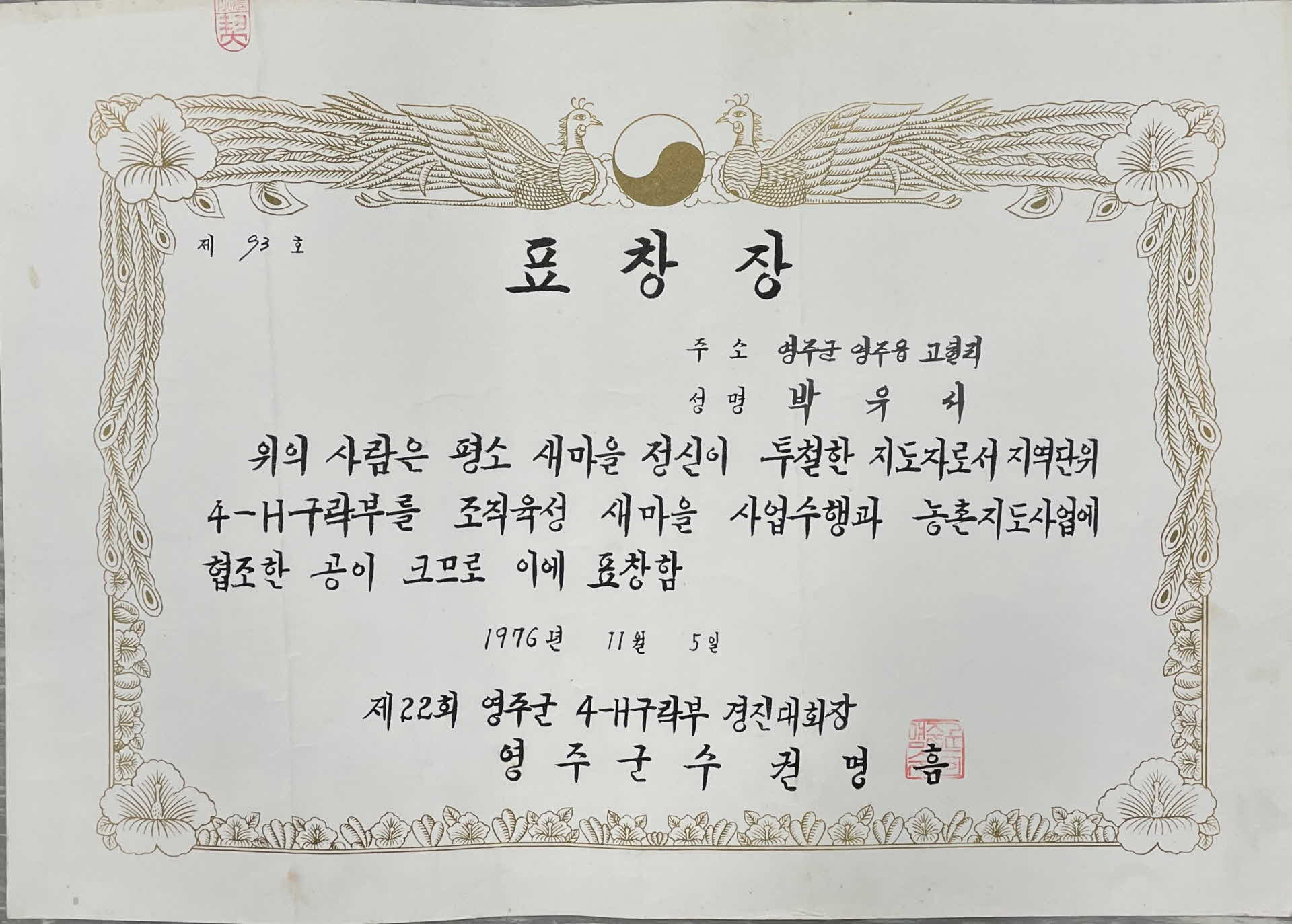 이 표창장은 1976년 11월 5일 제22회 영주군 4-H구락부 경진대회장 영주군수 권명흠이 평소 새마을 정신이 투철한 지도자로서 지역단위 4-H구락부를 조직육성 새마을 사업수행과 농촌지도사업에 협조한 공이 큰 영주군 영주읍 고현리 박유서에게 발급한 것이다. 발급번호는 제93호이다.