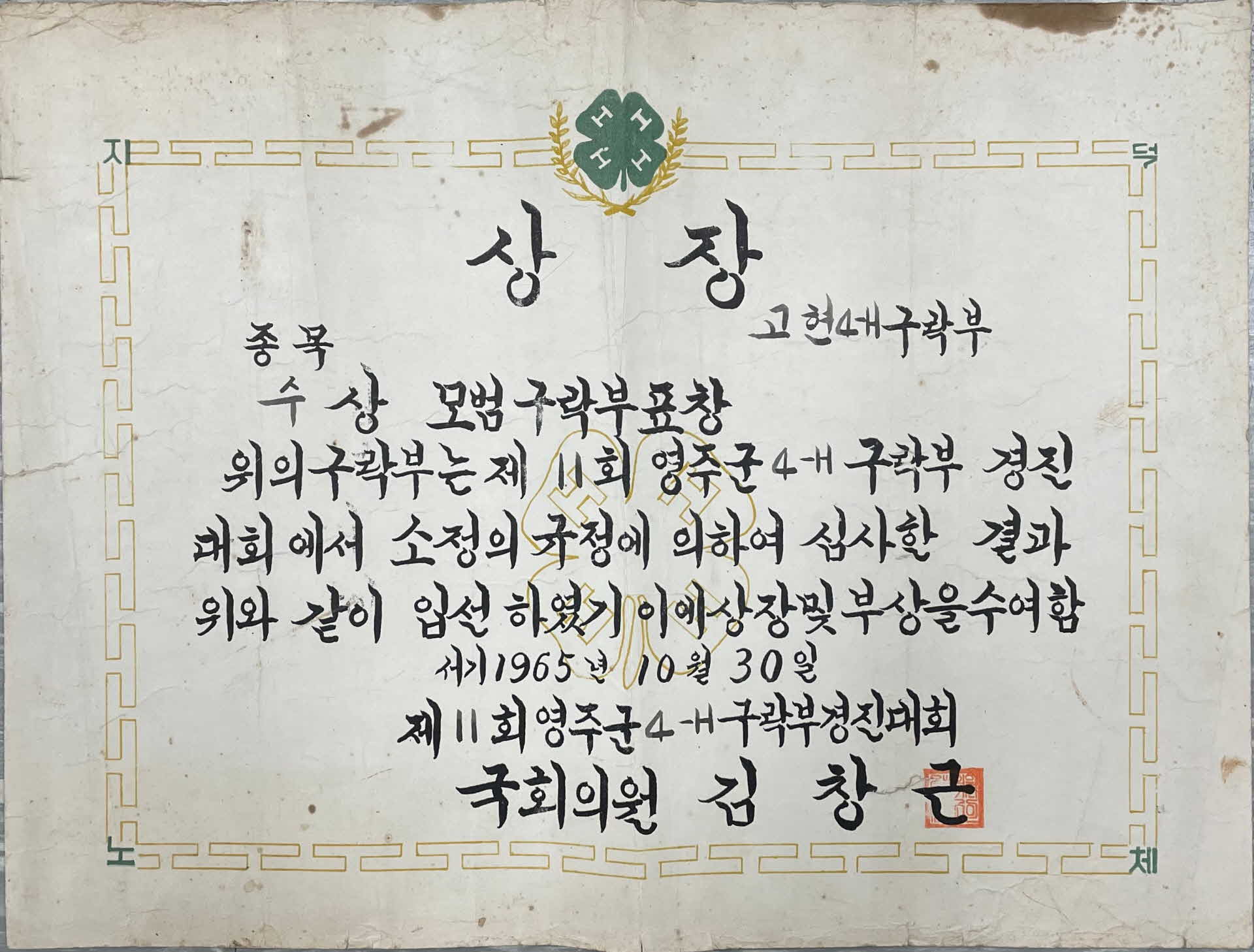 이 상장은 19651030일 제11회 영주군 4-H구락부 경진대회에서 국회의원 김창근이 제11회 영주군 4-H구락부 경진대회에서 모범 구락부 종목에 수상한 고현 4-H구락부에게 발급한 것이다.