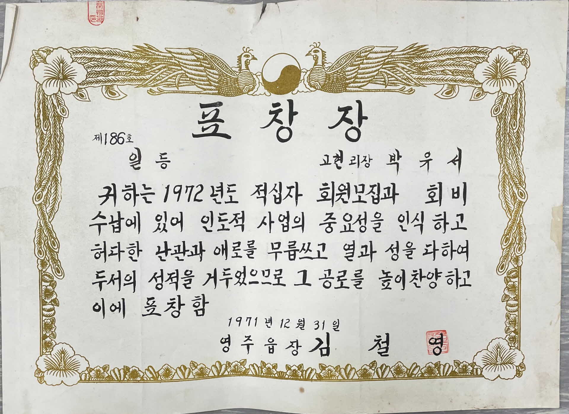 이 표창장은 1971년 12월 31일 영주읍장 김철영이 1972년도 적십자 회원 모집과 회비수납에 있어 인도적 사업의 중요성을 인식하고 허다한 난관과 애로를 무릅쓰고 열과 성을 다하여 1등을 수상한 고현 이장 박유서에게 발급한 것이다. 발급번호는 제186호이다.