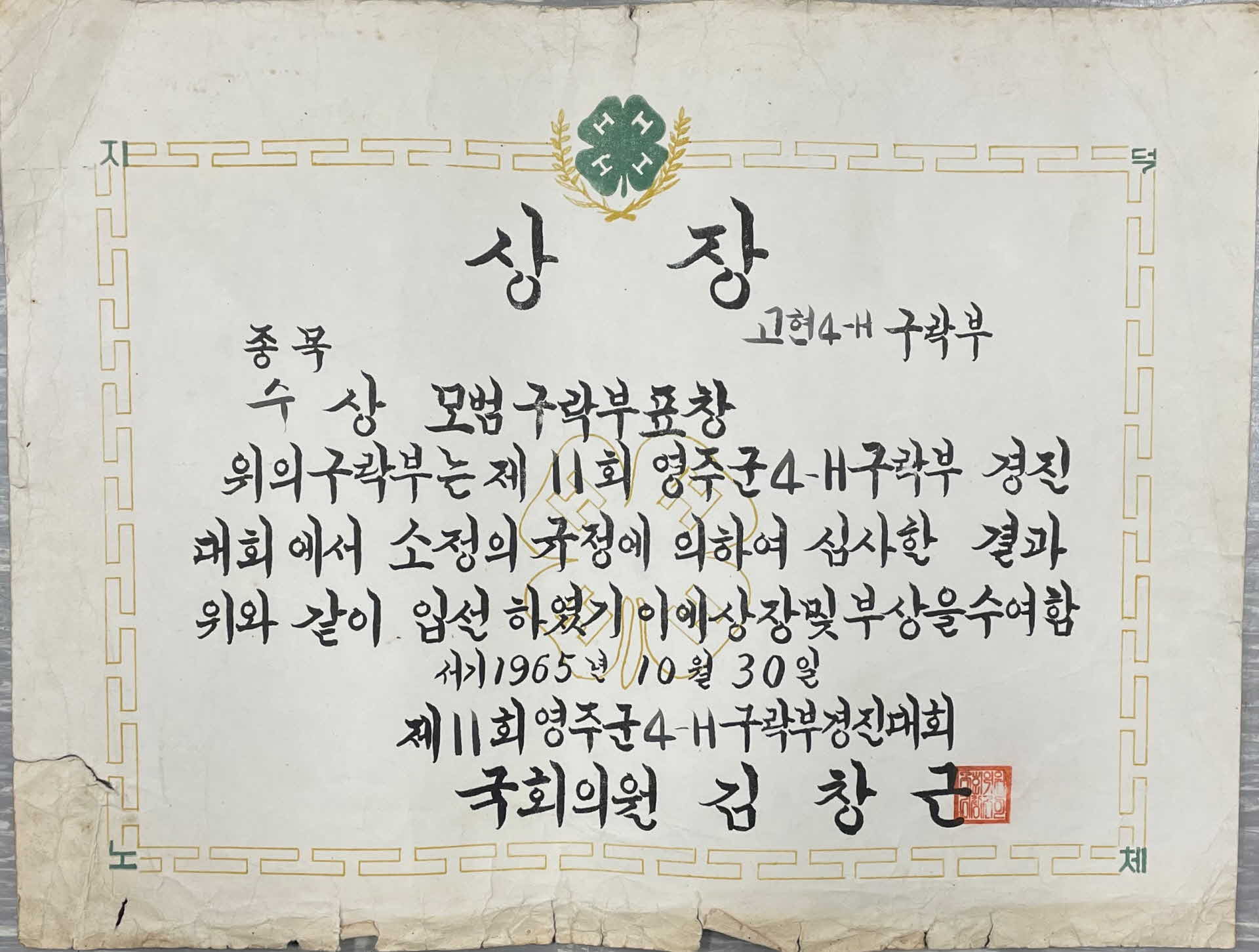 이 상장은 1965년 10월 30일 국회의원 김창근이 제11회 영주군 4-H 구락부 경진대회에서 모범구락부로 수상한 고현 4-H 구락부에 발급한 것이다.