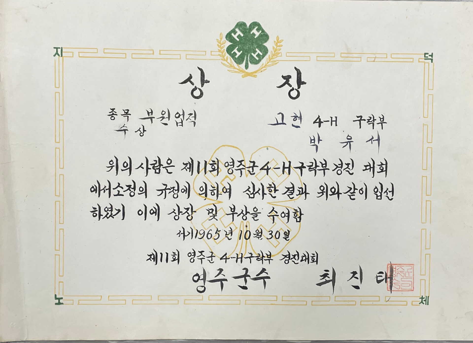 이 박유서 상장은 1965년 10월 30일 영주군수 최진태가 고현 4-H 구락부의 박유서에게 발급한 것이다. 내용은 제11회 영주군 4-H 구락부경진 대회에서 남다른 업적으로 수상한 고현 4-H 구락부의 박유서에게 상장 및 부상을 수여한다는 것이다.