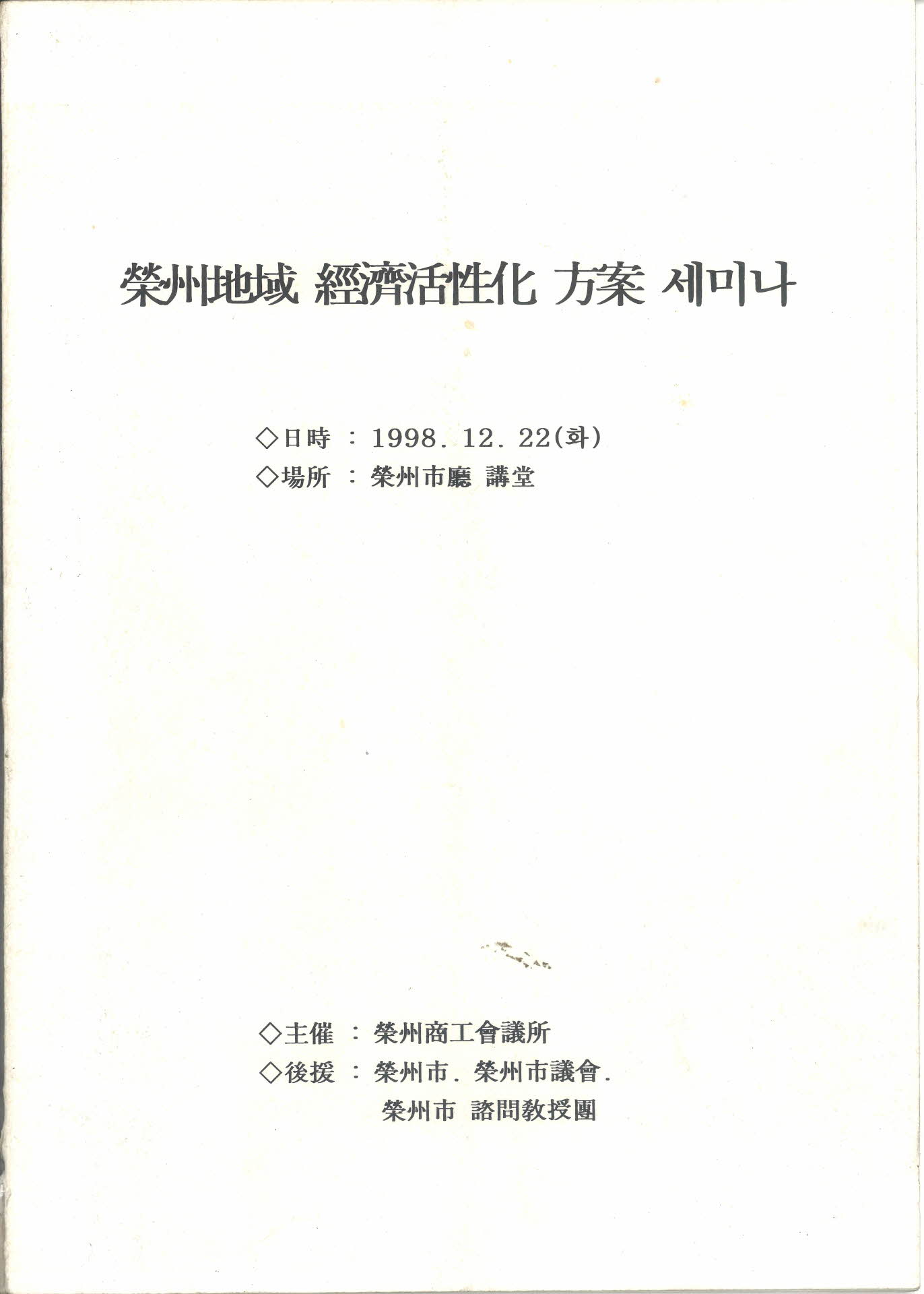 1998년 12월 22일(화) 영주시청 강당에서 영주상공회의소가 주최하고 영주시, 영주시 의회, 영주시 자문교수단이 후원한 영주지역 경제활성화 방안 세미나 발표 자료집이다. 자료집은 59쪽으로 되어 있다. 주제 발표는 ‘영주지역 경제활성화를 위한 소득증대 마케팅 전략’, ‘지역상권 개발전략’, ‘지역특성에 기반을 둔 도시발전방안’ 등이었다.